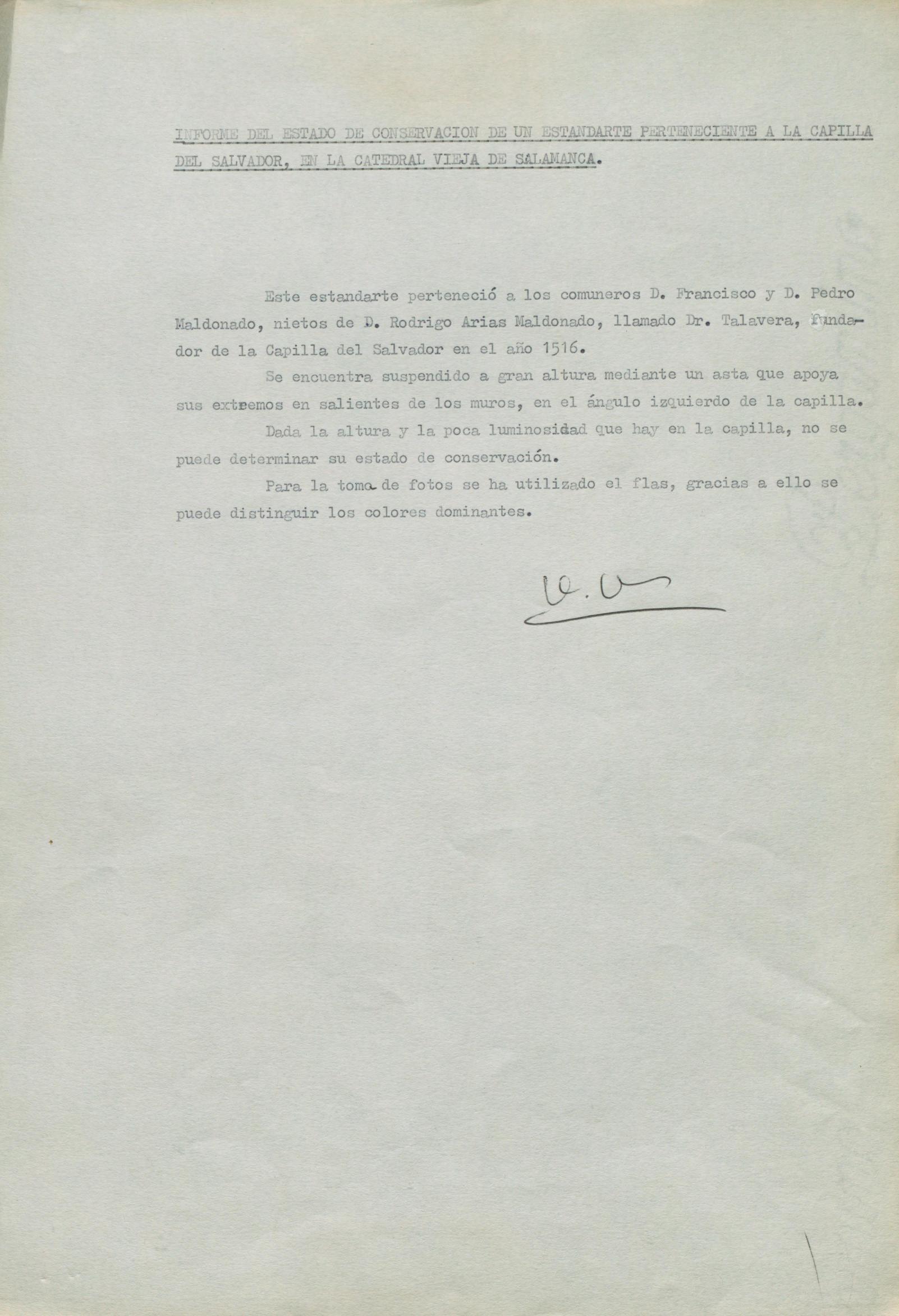 Informe de visita para la conservación de un estandarte de los Comuneros del siglo XVI de la Capilla del Salvador de la Catedral Vieja de Salamanca