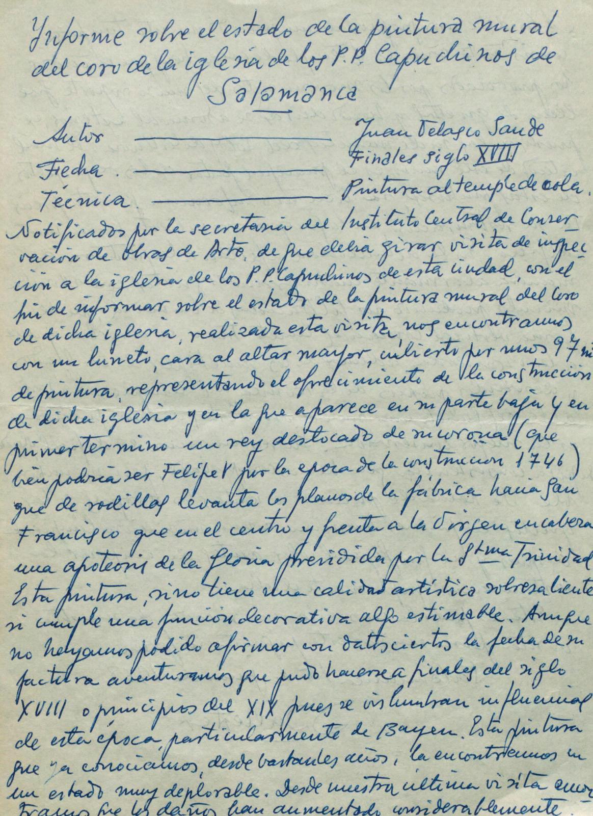 Informe de visita sobre la inspección de la pintura mural del coro de la Iglesia de los Padres Capuchinos (Salamanca)