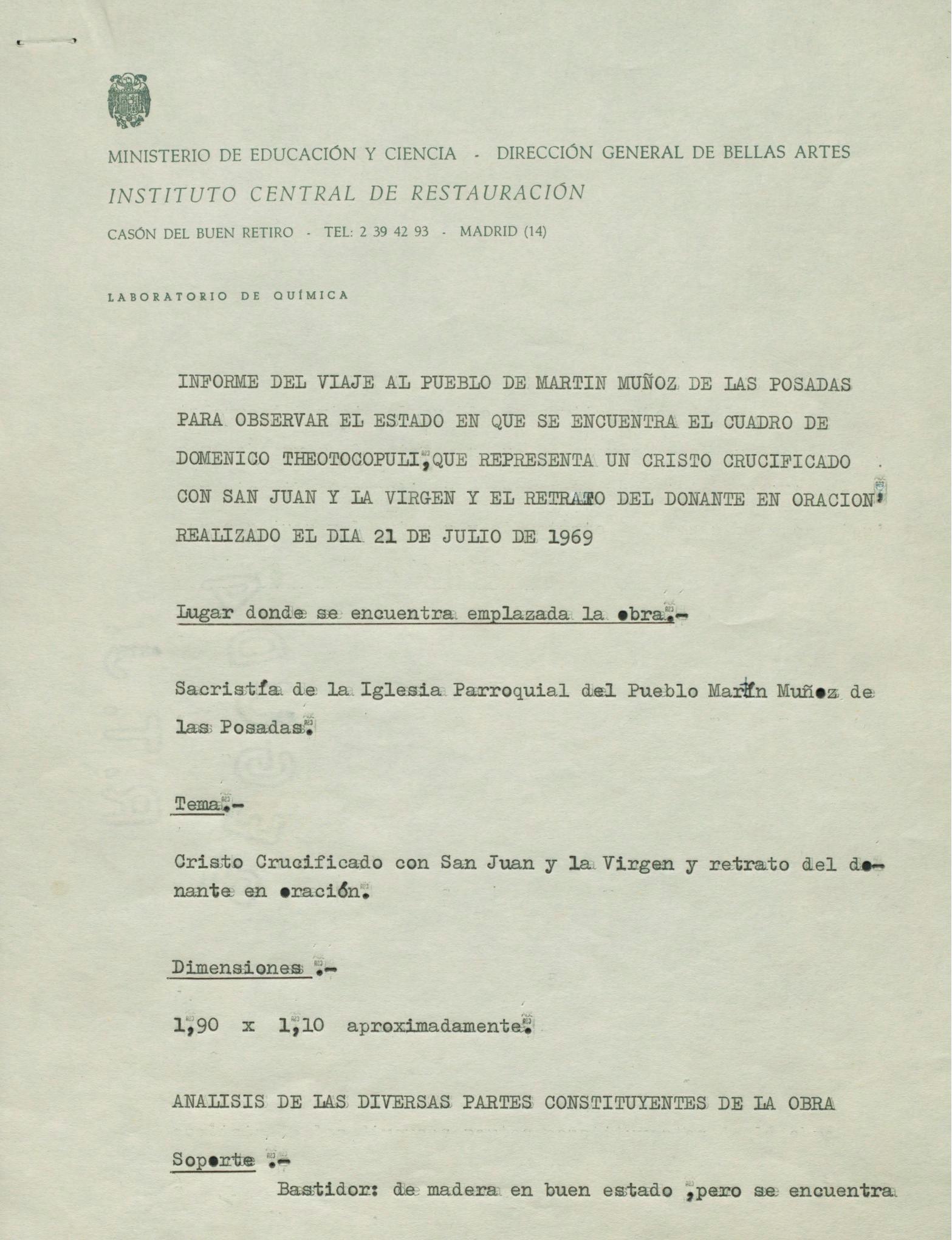 Informe de conservación de los cuadros "Cristo crucificado con San Juan y la Virgen" y "Retrato del donante en oración", ambos de El Greco, procedentes de la Iglesia parroquial de Martín Muñoz de las Posadas (Segovia)