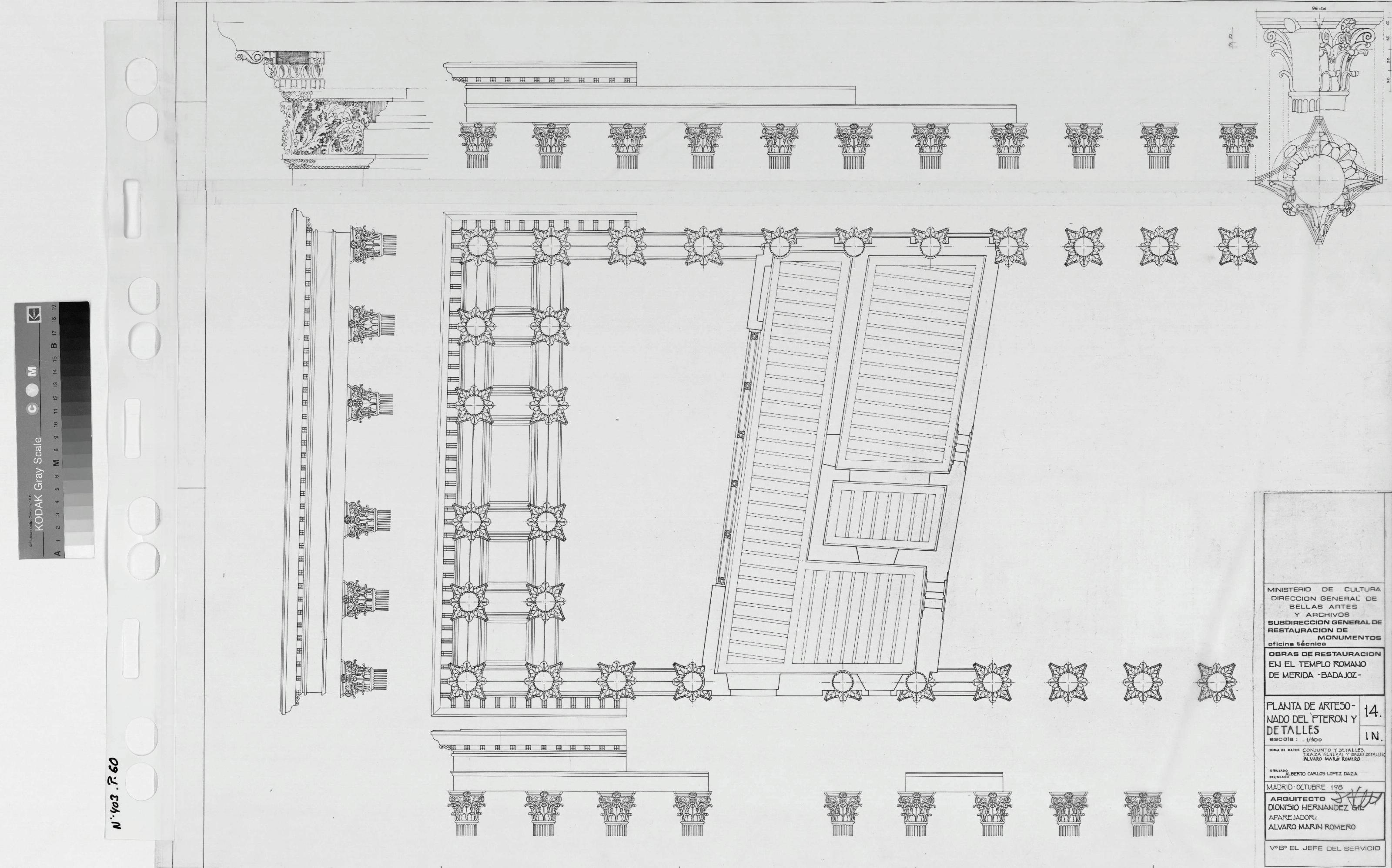 OBRAS DE RESTAURACION EN EL TEMPLO ROMANODE MERIDA (Badajoz): PLANTA DE ARTESONADO DEL PTERON Y DETALLESCon abatimientos en planta de cada fachada en zonas altas correspondientes a capiteles y entablamentoCon detalles de Capitel sin especificar escala Firmado