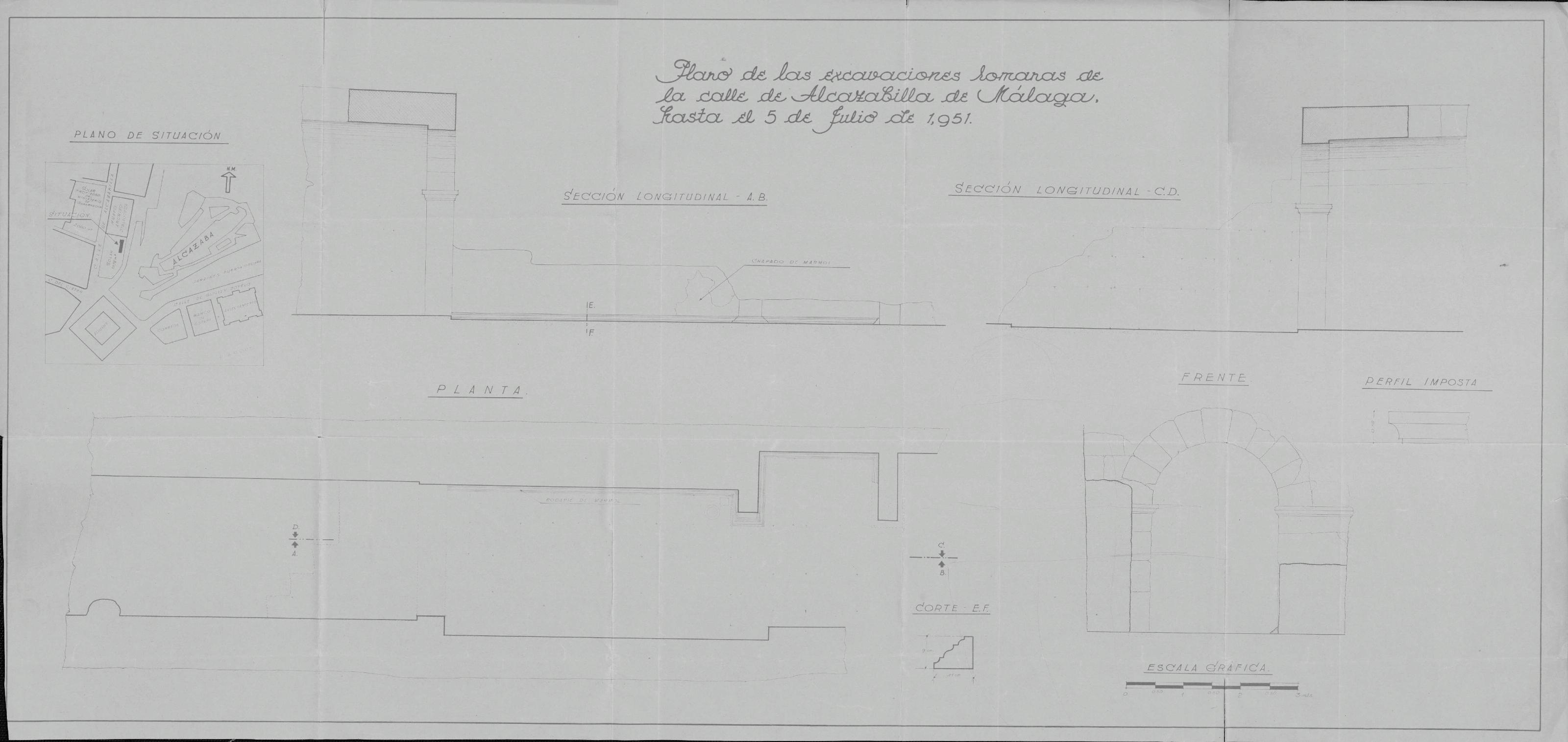 Teatro Romano: Teatro Romano de Málaga Plano de las excavaciones romanas en la calle Alcazabilla, hasta el 5 de julio de 1951 Plano de situación Planta Sección trasversal A-B Sección longitudinal C-D Frente - Perfil Imposta Corte E-F