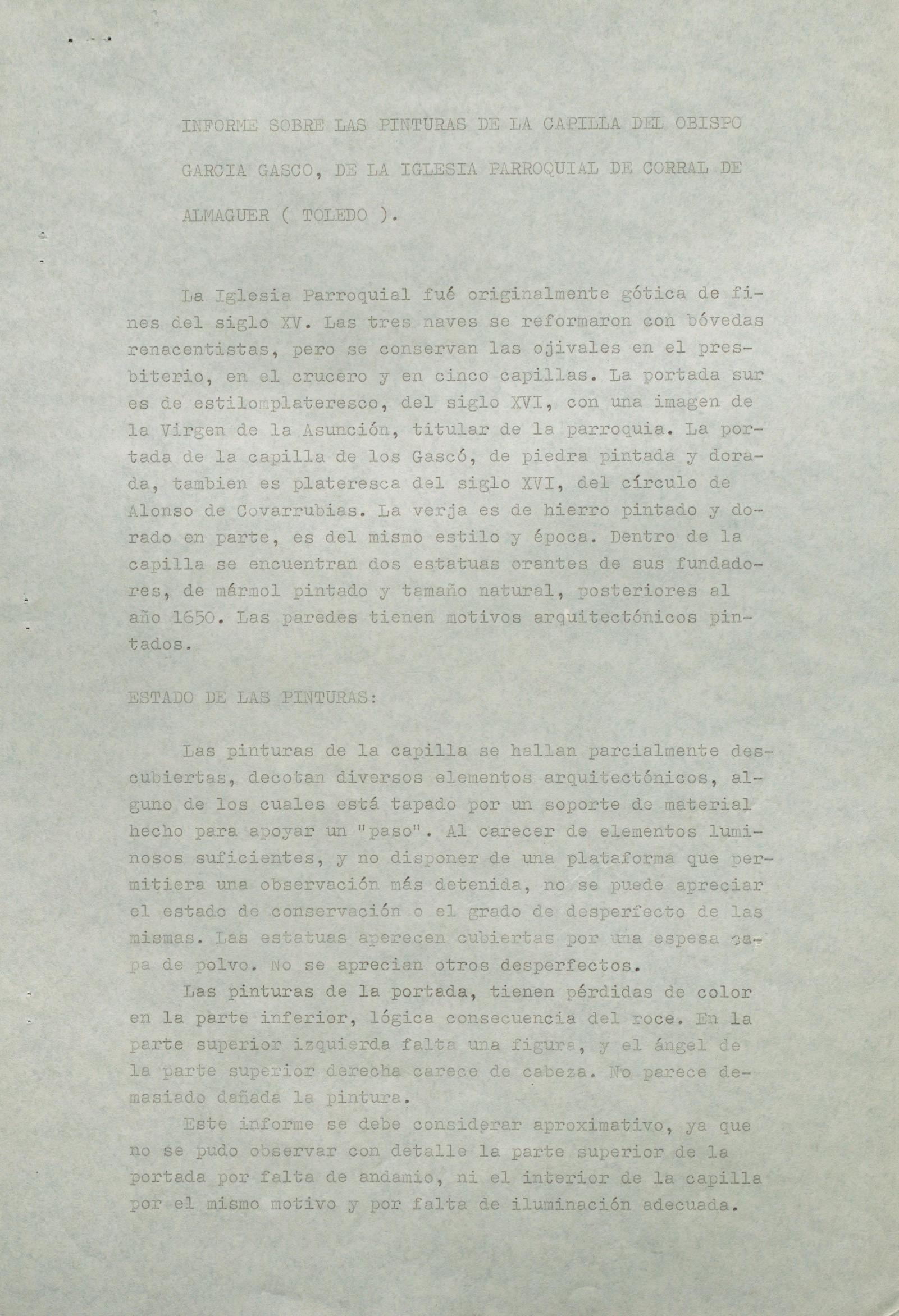 Informe de visita para la conservación de una pintura mural de la Iglesia parroquial de Corral de Almaguer (Toledo)
