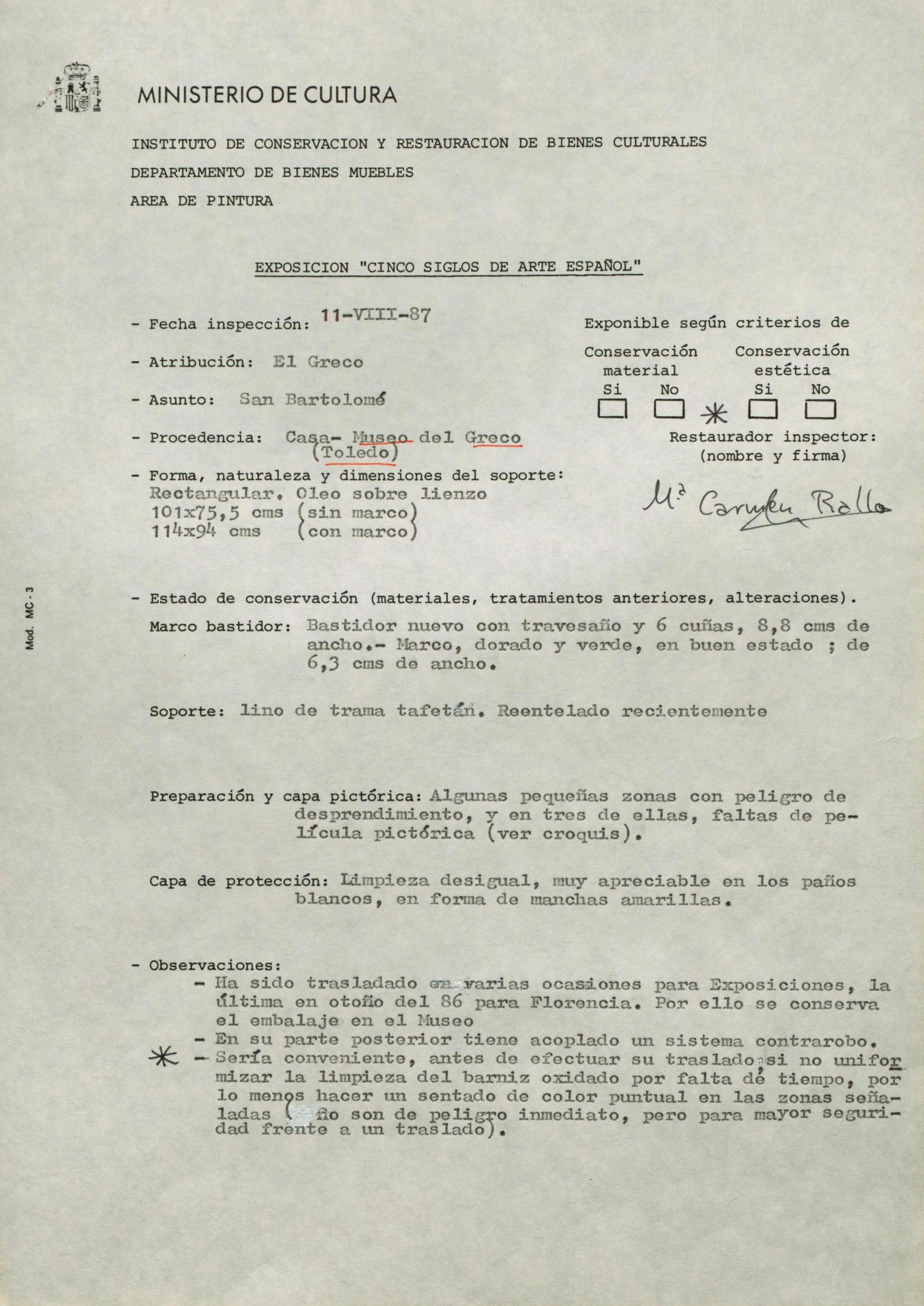 Restauración del óleo sobre lienzo "San Bartolomé", de El Greco, procedente de la Casa Museo de El Greco (Toledo)