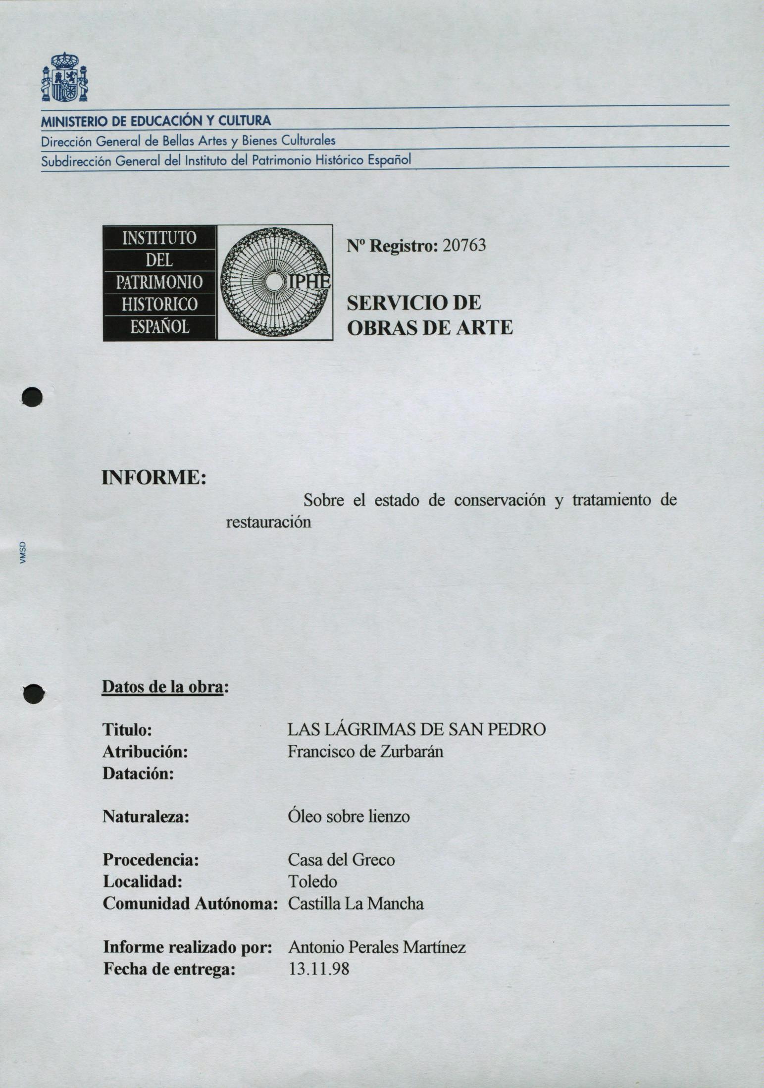 Restauración del lienzo "Las lágrimas de San Pedro", de Francisco de Zurbarán, procedente de la Casa Museo El Greco (Toledo)