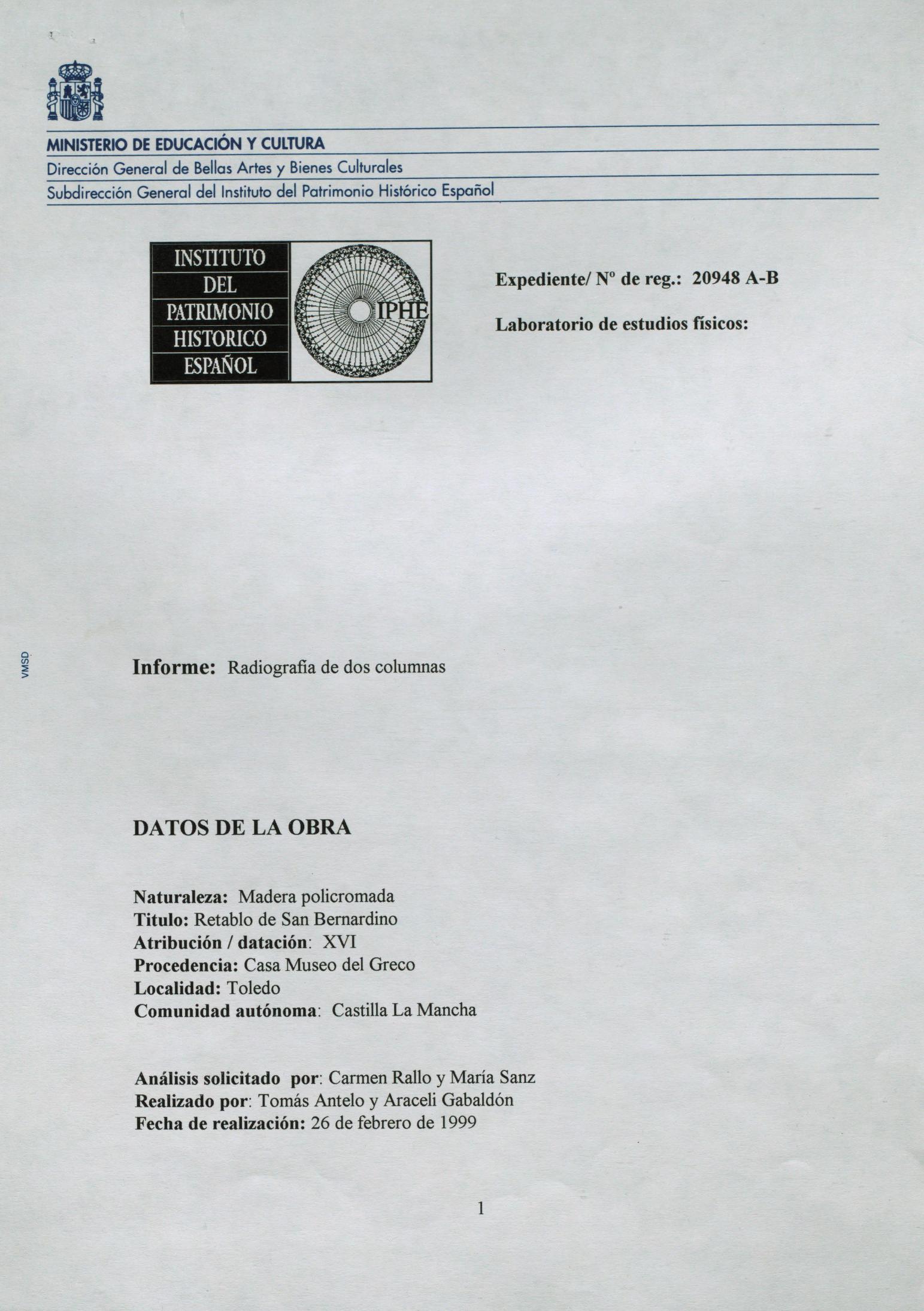 Informe sobre análisis radiográfico de dos columnas, procedentes de la Casa Museo de El Greco (Toledo)