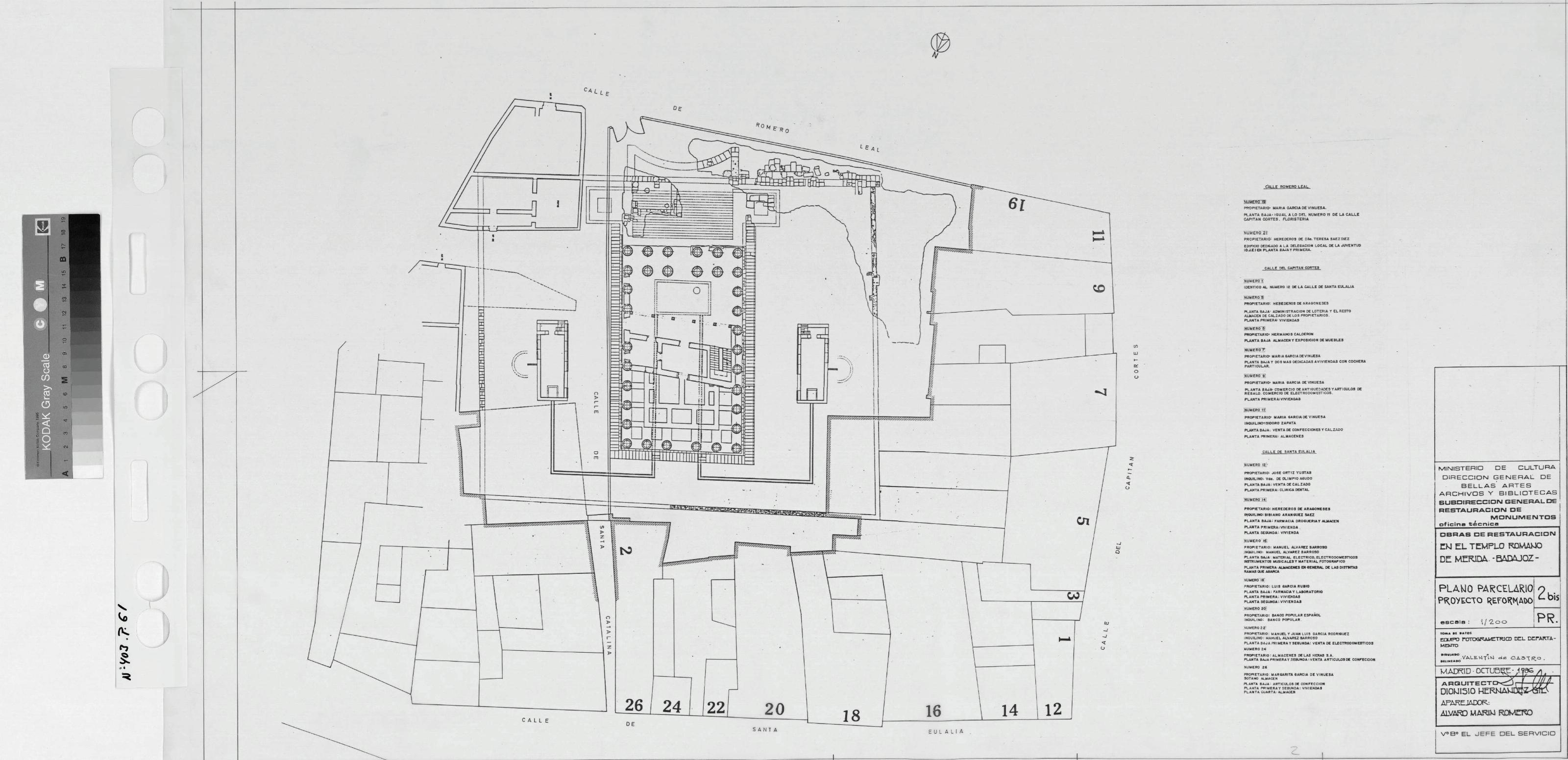 OBRAS DE RESTAURACION EN EL TEMPLO ROMANODE MERIDA (Badajoz): PLANO PARCELARIO - PROYECTO REFORMADOCon dibujo de planta a escala,Amplia leyenda con nombres de negocios o propietarios o inquilinos desolares adyacentes.Firmado