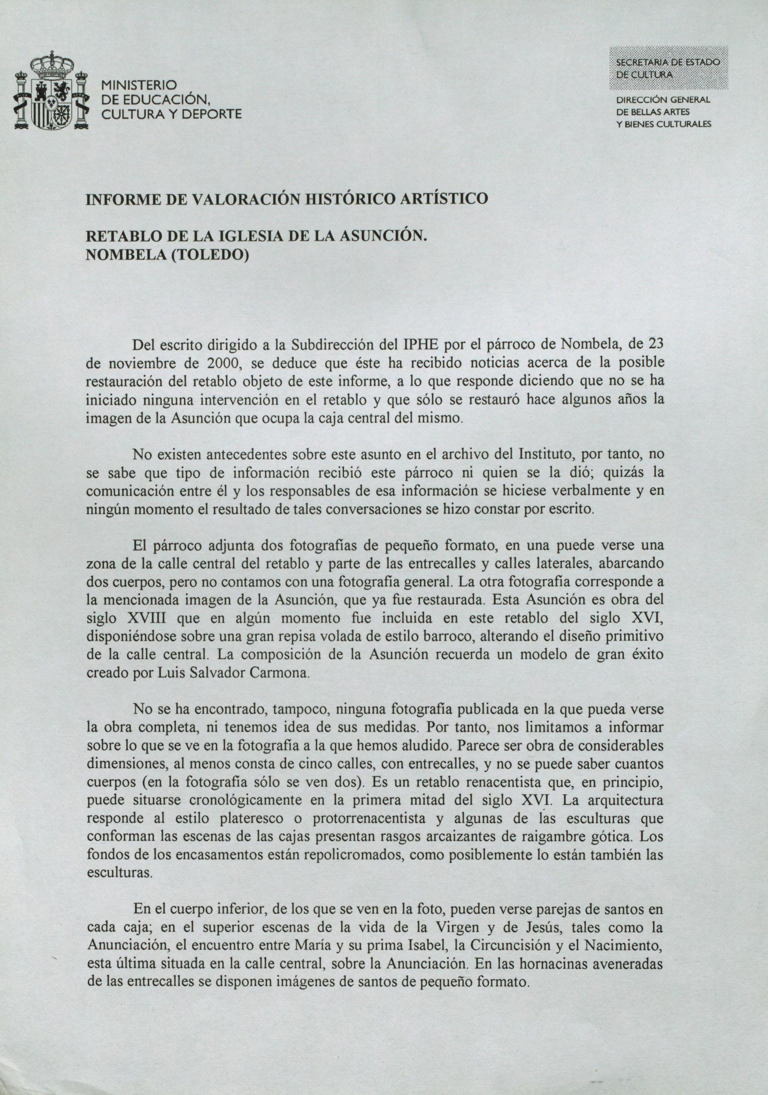 Informe histórico-artístico del retablo de la Iglesia parroquial de Nombela (Toledo)