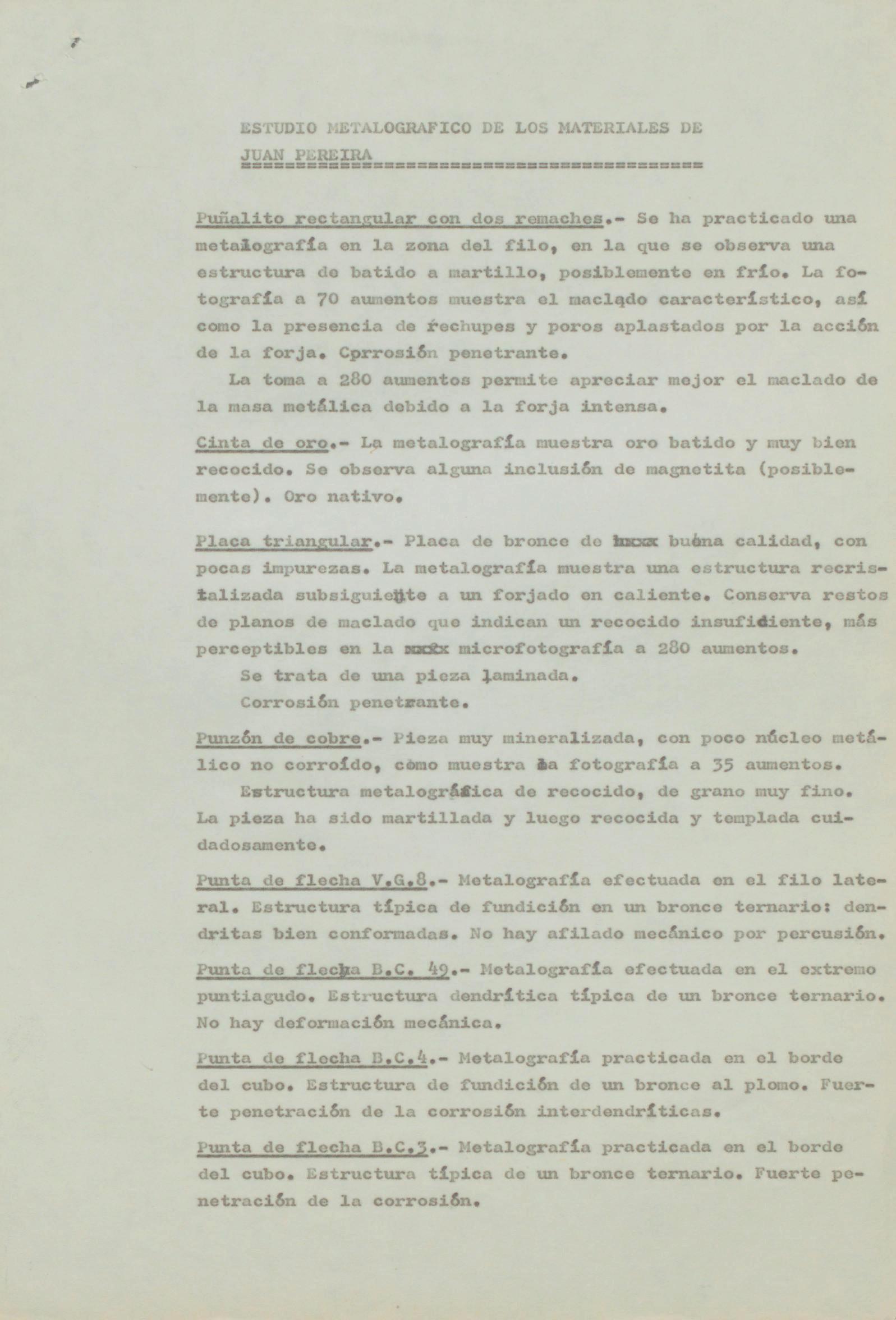 Informe de análisis metalográfico de piezas arqueológicas de los yacimientos del Cerro de la Encantada ydel Cerro de Bu de Toledo, procedentes de la colección particular de Juan Pereira (Toledo)