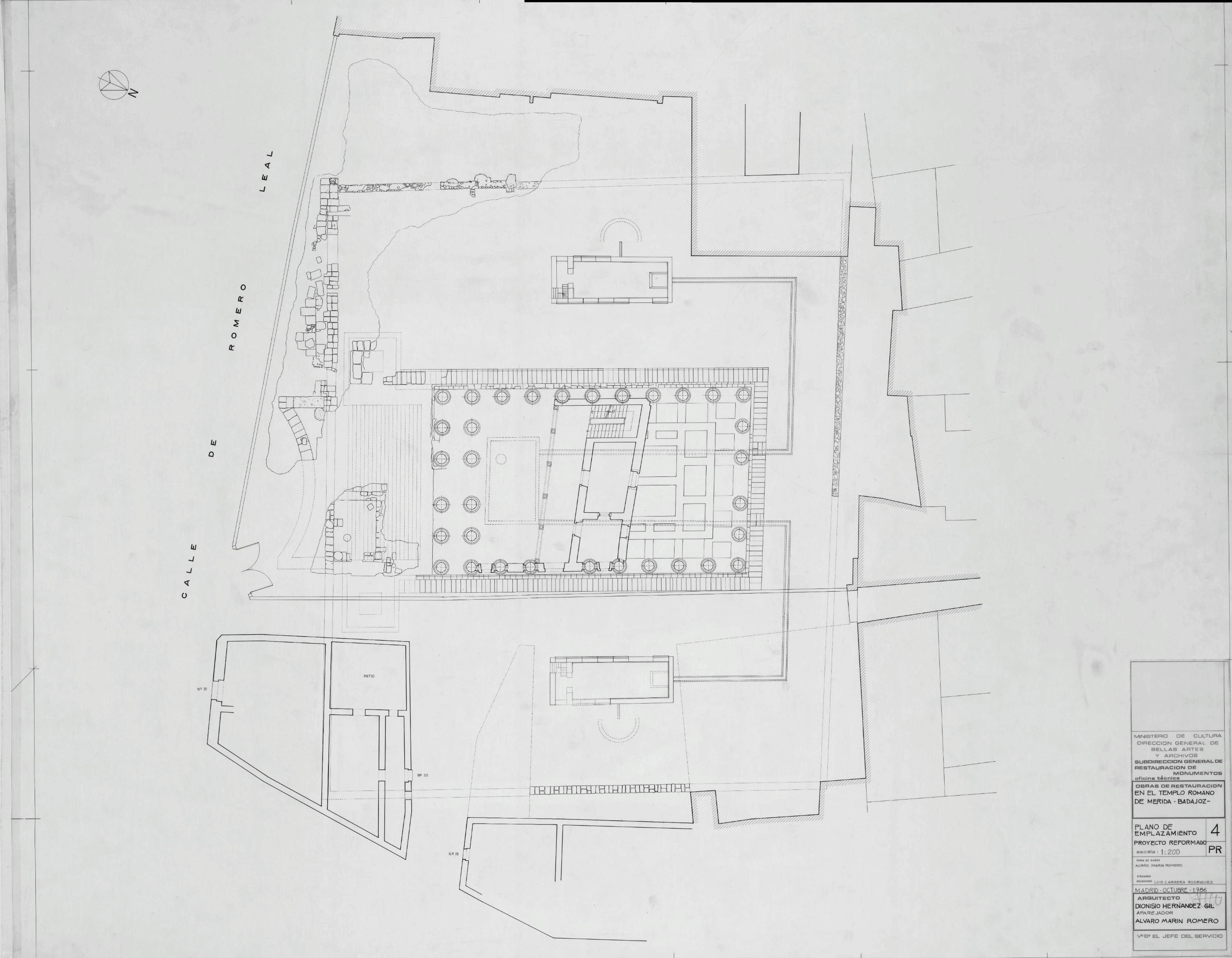 OBRAS DE RESTAURACION EN EL TEMPLO ROMANODE MERIDA (Badajoz): PLANO DE EMPLAZAMIENTO - PROYECTO REFORMADOCon dibujo de planta a escala,Situación en solar y relación con edificaciones colindantesFirmado