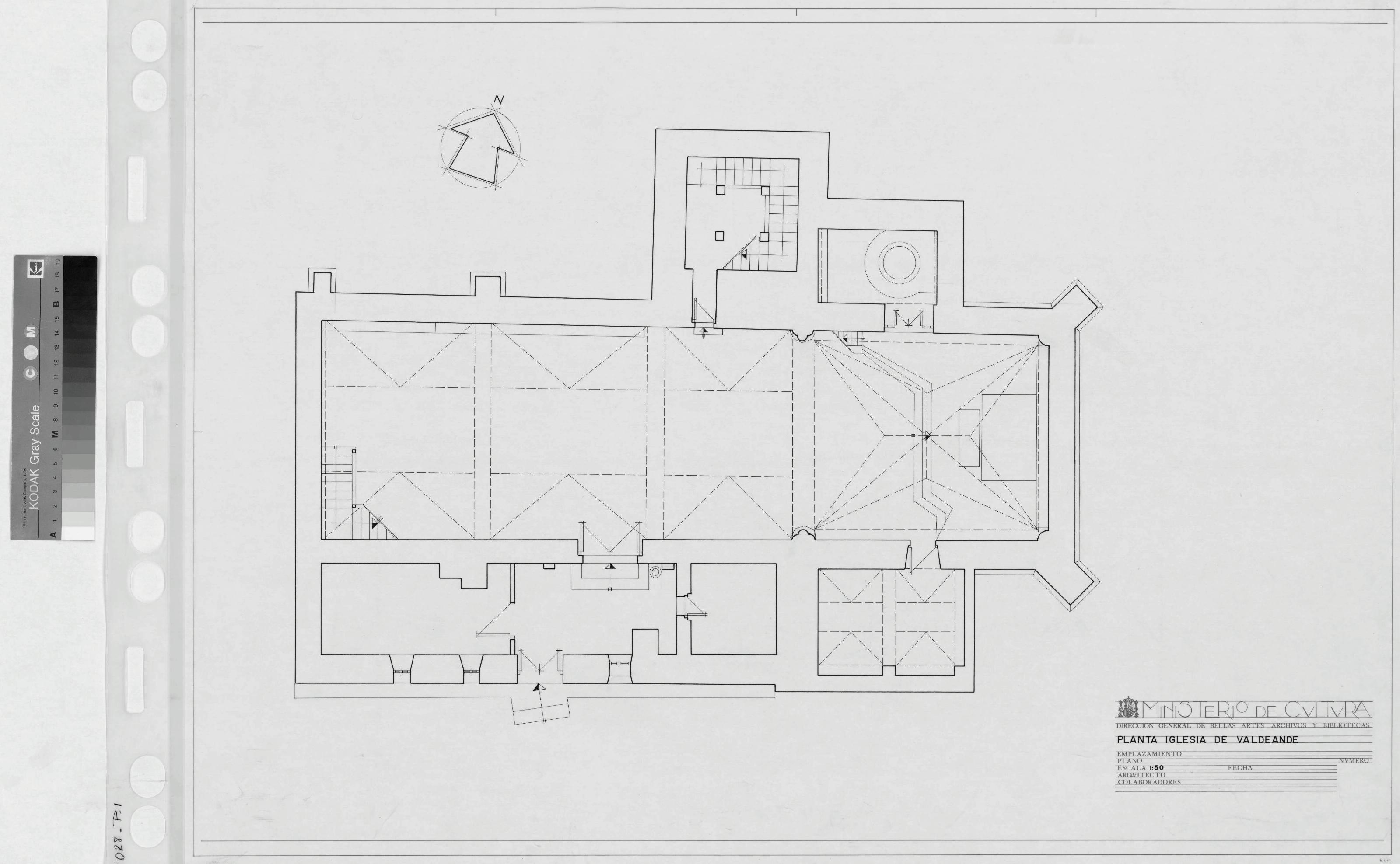 IGLESIA DE VALDEANDE - BURGOS -: PLANTA GENERAL .Con proyeccion de bovedas y techos, plano sin cotas. Planos realizados por personas contratadas por el INEM.