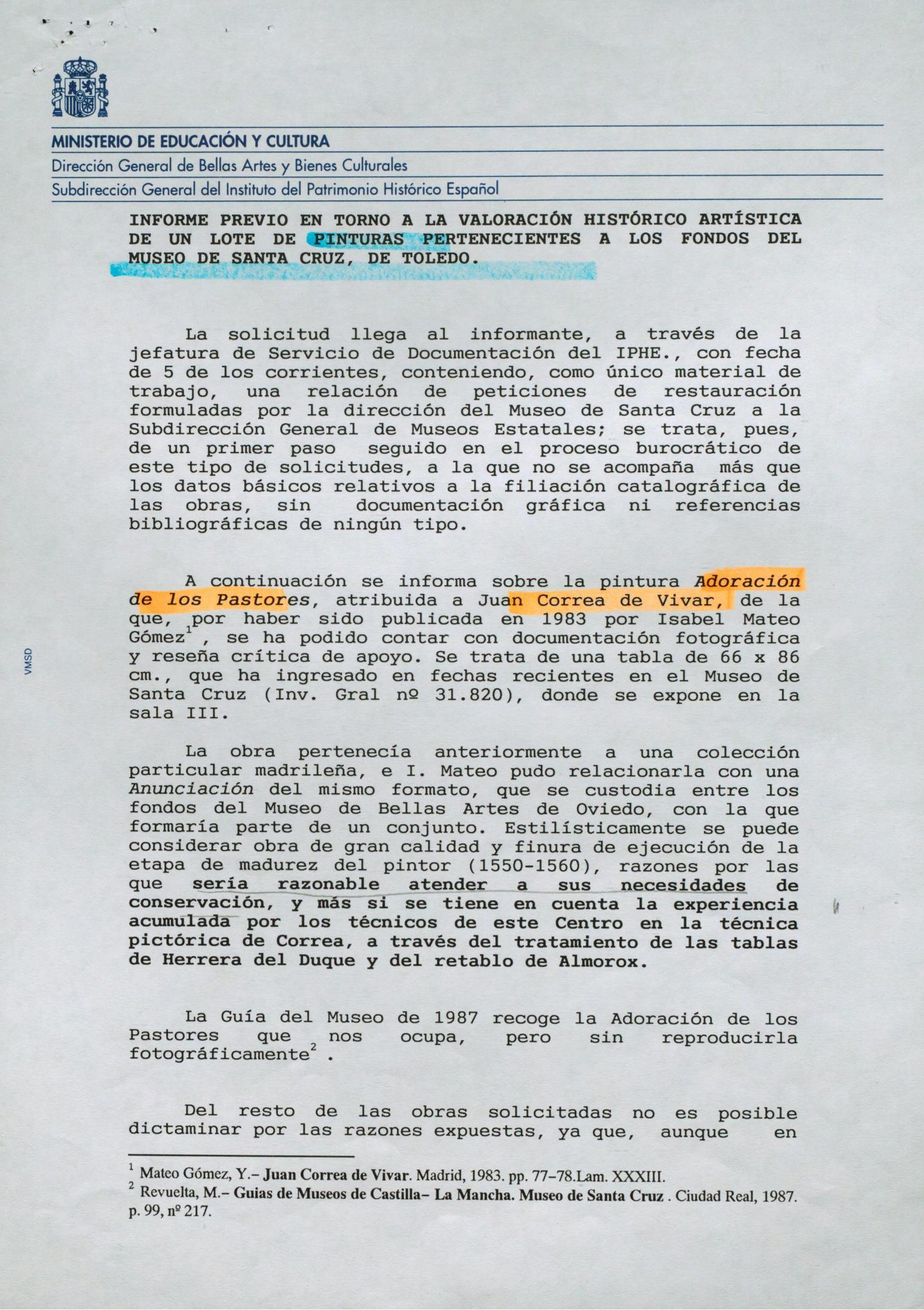 Informe histórico-artístico de la tabla "Adoración de los Pastores", de Juan Correa de Vivar, propiedad del Museo de Santa Cruz de Toledo
