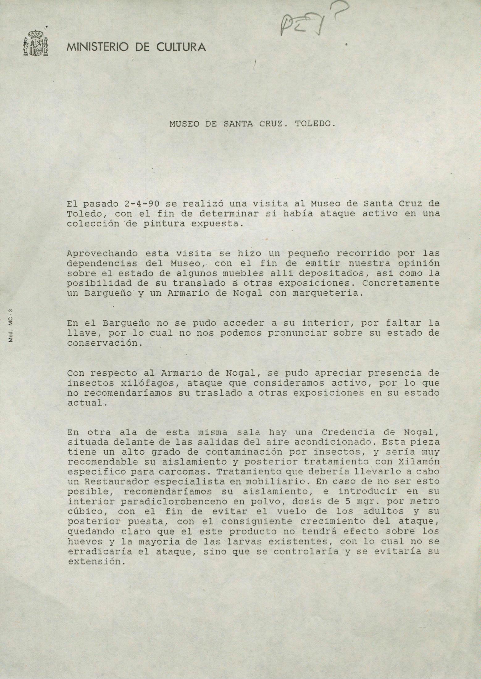 Informe de visita sobre el deterioro de muebles del Museo de Santa Cruz de Toledo