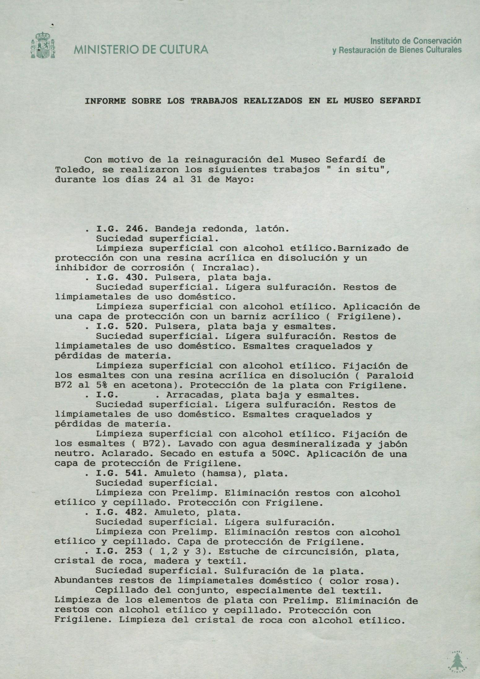 Informe sobre los trabajos de restauración realizados in situ con motivo de la reinauguración del Museo Sefardí (Toledo)