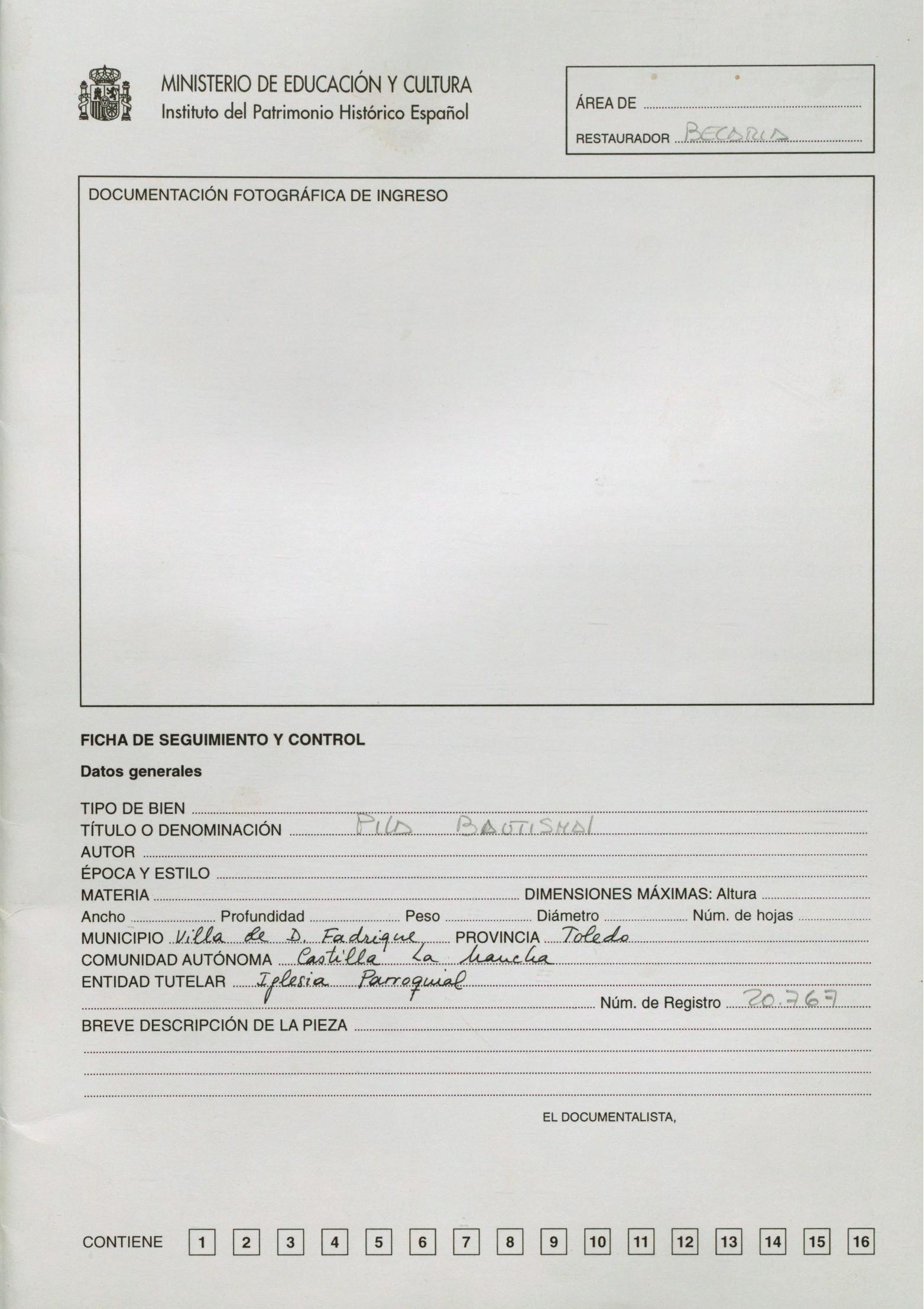 Restauración de una pila bautismal de piedra, del siglo XVI, de la Iglesia parroquial de la Villa de Don Fadrique (Toledo)