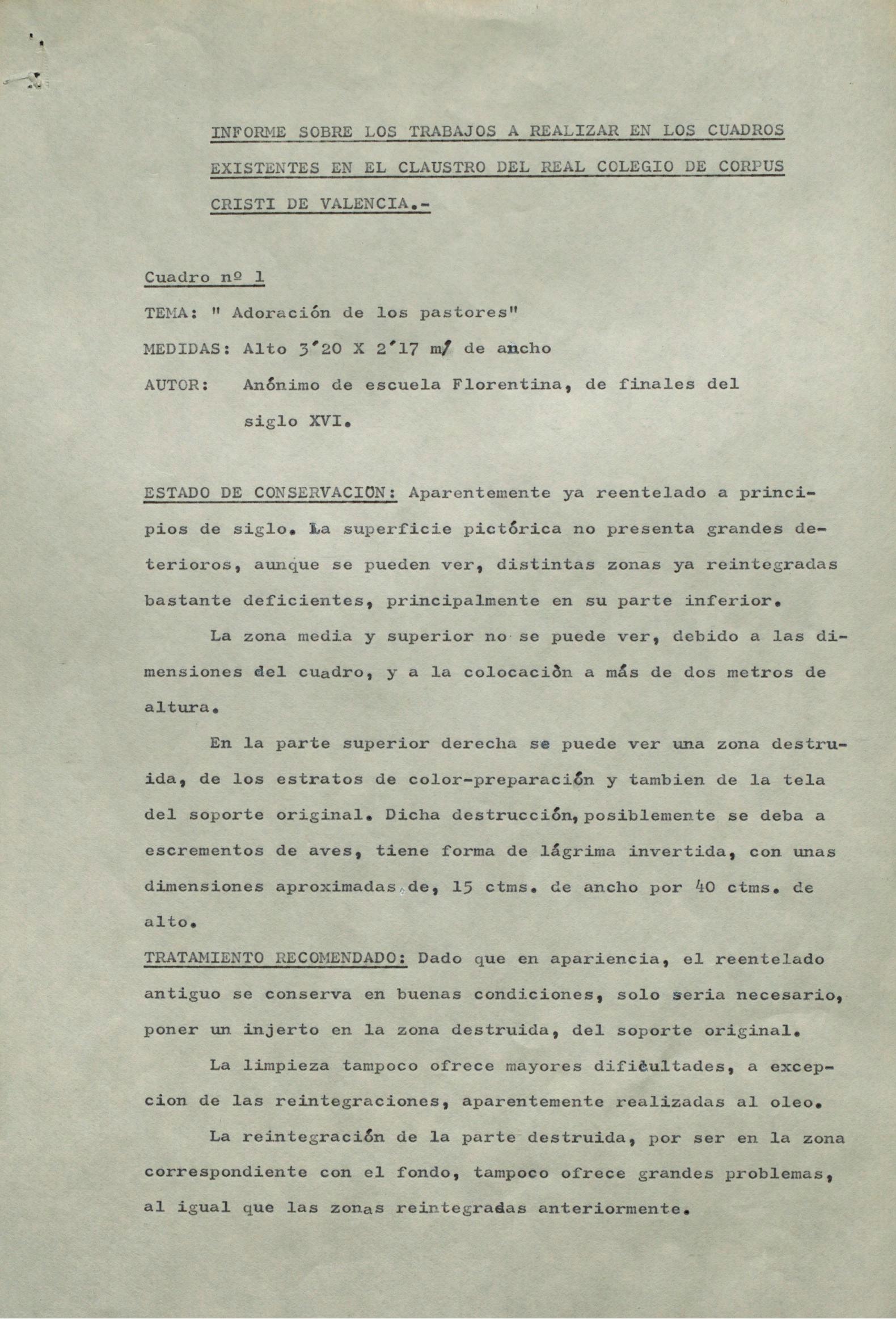 Informe para la restauración de cuatro cuadros del claustro del Colegio del Corpus Christi de Valencia