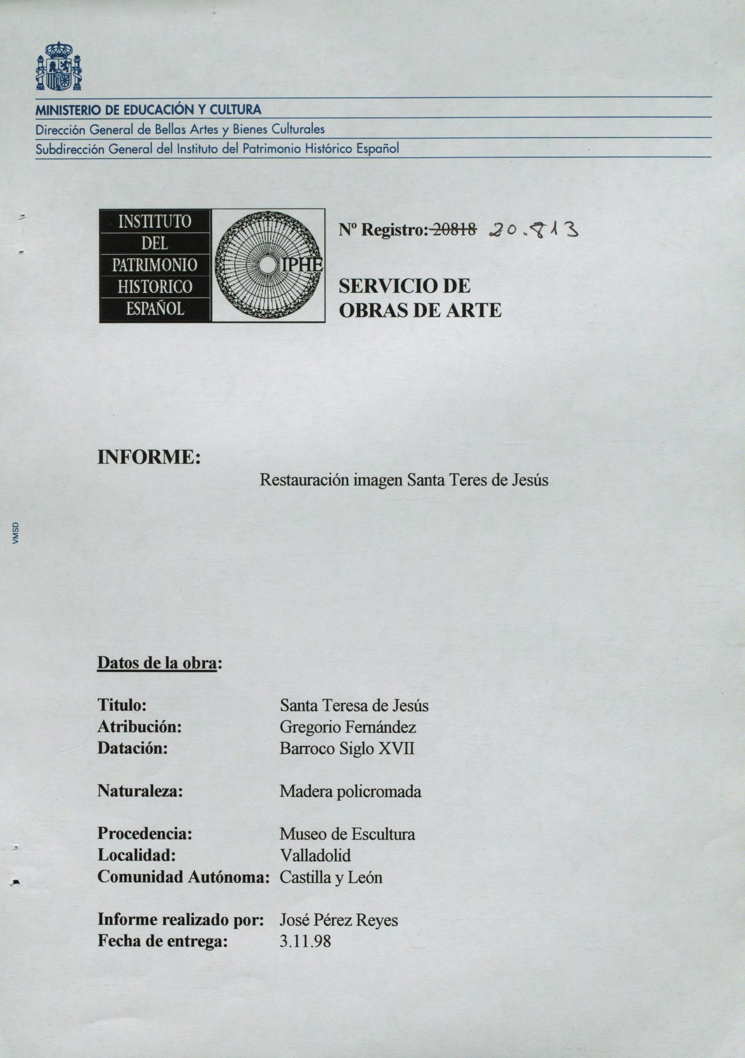 Informe para la restauración de una escultura en madera policromada de "Santa Teresa de Jesús", de Gregorio Fernández, del Museo Nacional de Escultura (Valladolid)