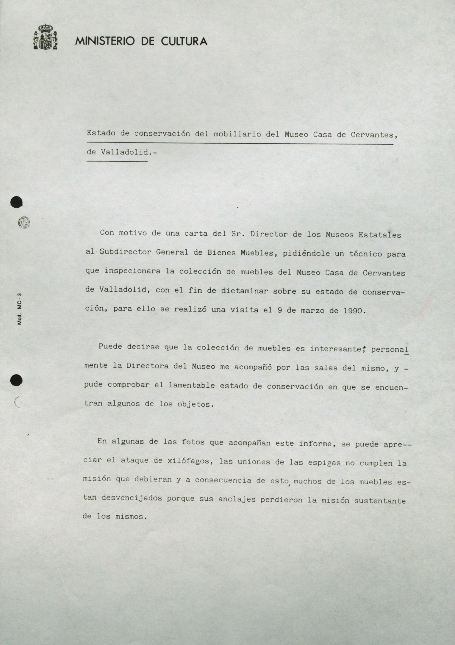 Informe de visita para la conservación del mobiliario del Museo Casa Cervantes (Valladolid)