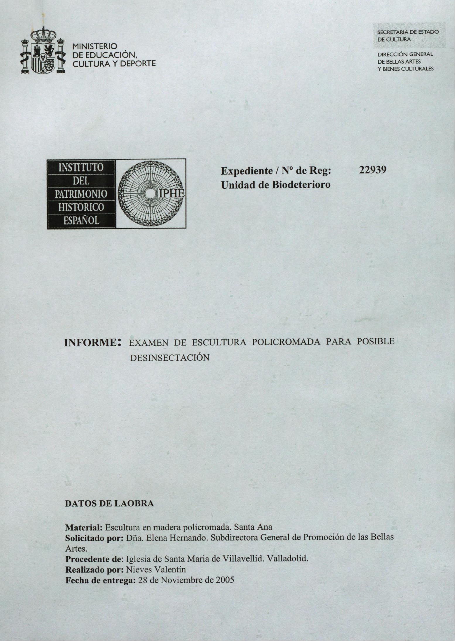 Informes de laboratorio sobre el examen para su posible desinsectación, de las esculturas de "Santa Ana" y "Virgen con el Niño", de la Iglesia de Santa María de Villavellid (Valladolid)