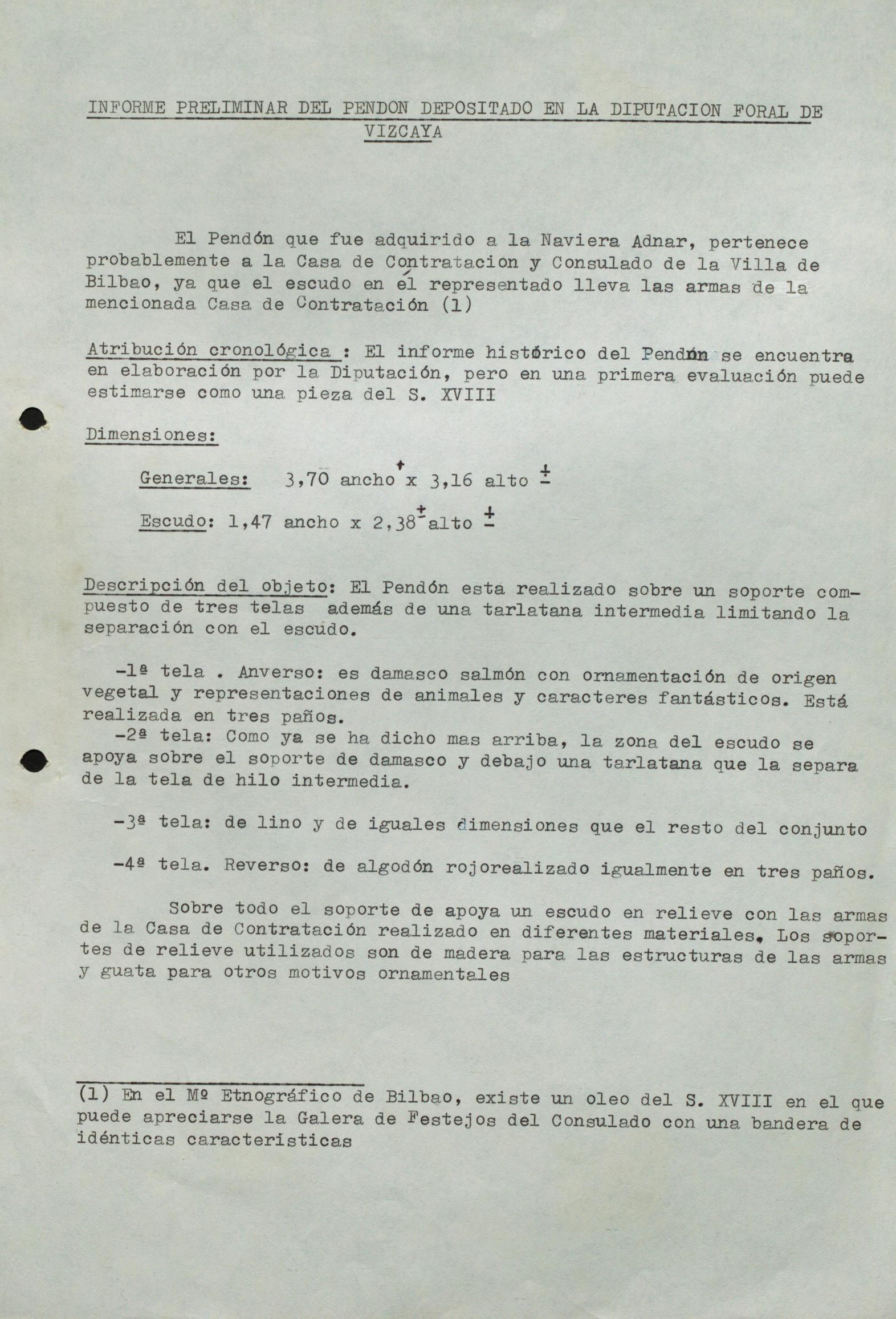 Informe de conservación de un pendón, probablemente perteneciente a la Casa de Contratación y Consulado de la Villa de Bilbao, procedente de la Diputación Foral de Vizcaya
