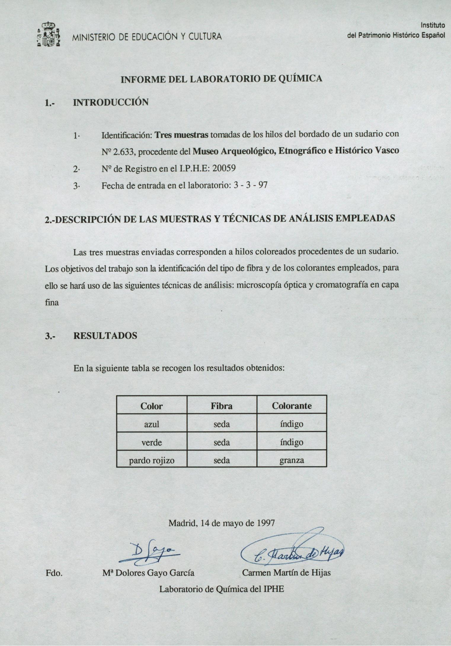 Informe de laboratorio sobre las fibras utilizadas para la elaboración de las grecas bordadas de un sudario de lino procedente del Museo Arqueológico, Etnográfico e Histórico Vasco (Bilbao)