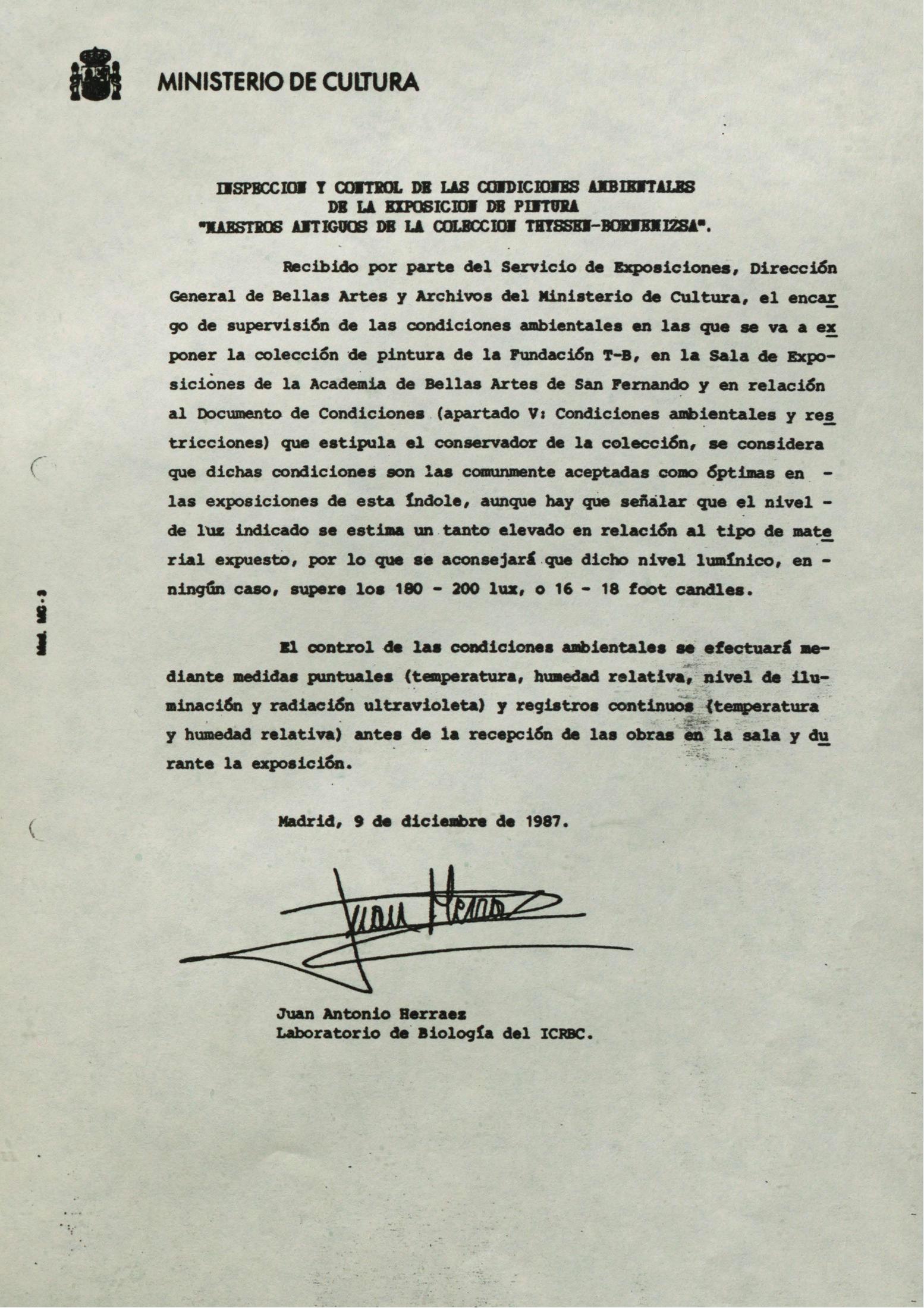 Informes de condiciones ambientales de la exposición "Maestros antiguos en la Colección Thyssen-Bornemisza", realizada en la Academia de Bellas Artes de San Fernando (Madrid)
