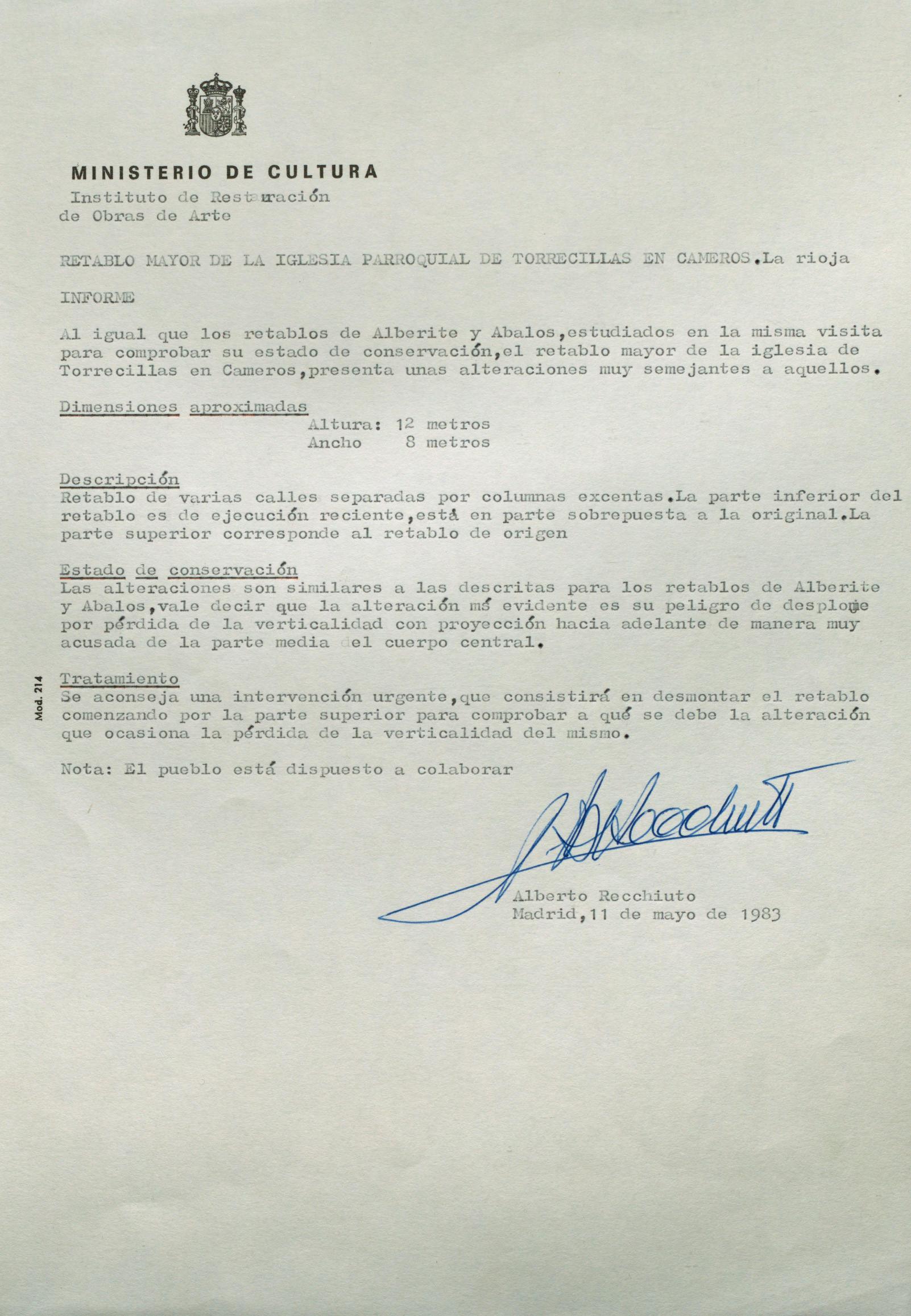 Informe de visita para la restauración del retablo mayor de la Iglesia de San Martín de Torrecilla en Cameros (La Rioja)