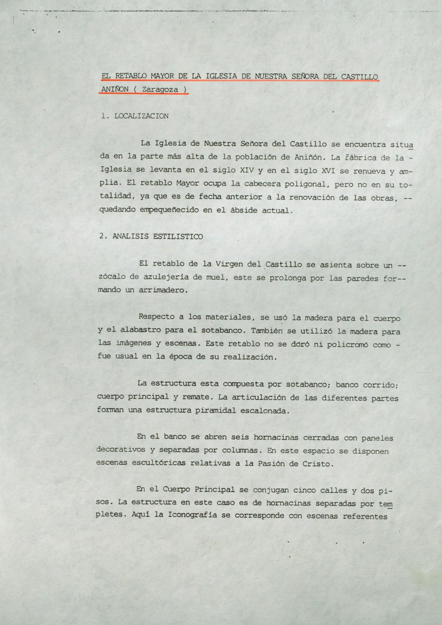 Informe de visita para la restauración del retablo mayor del siglo XV de la Iglesia de Nuestra Señora del Castillo de Aniñón (Zaragoza)