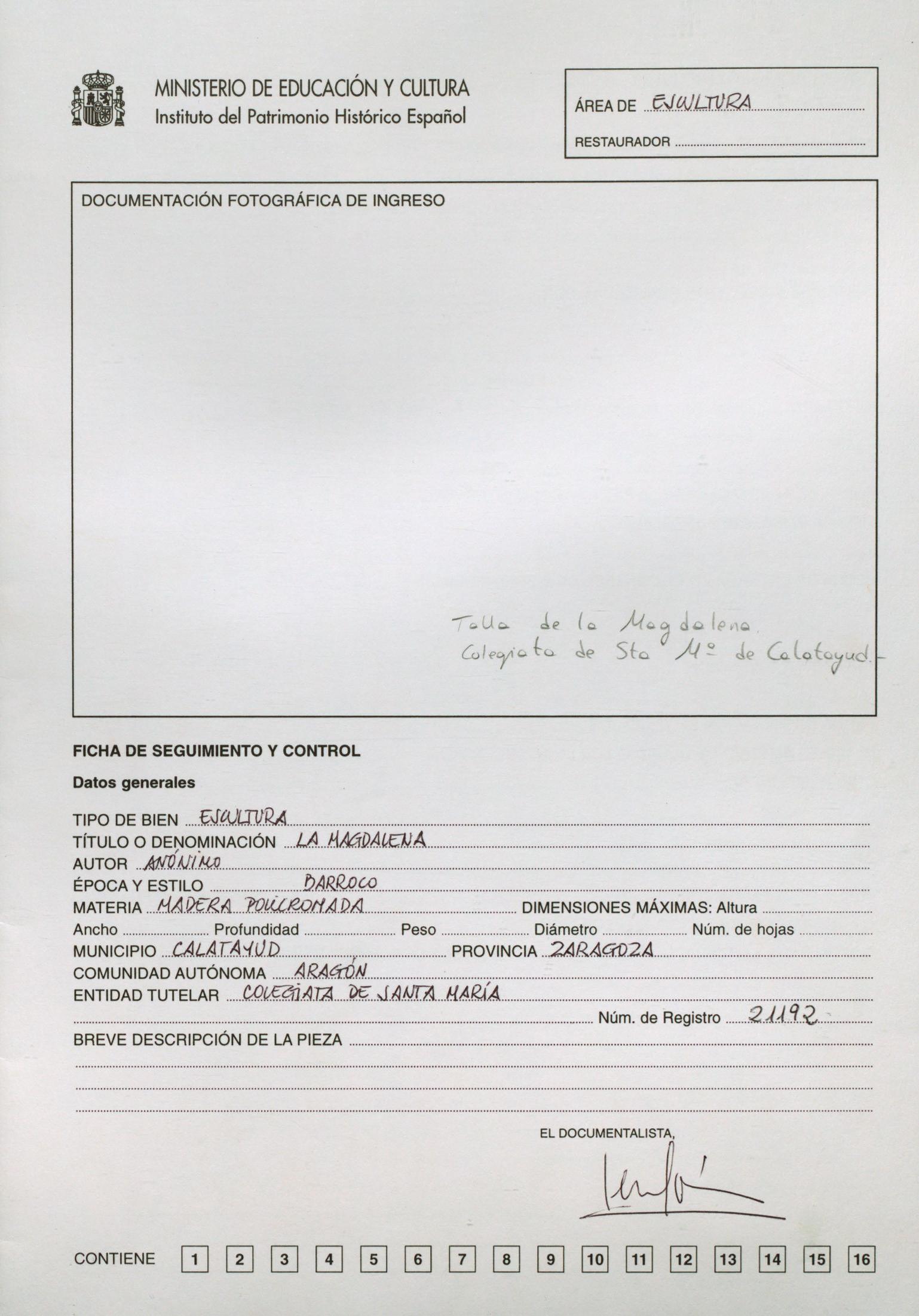 Restauración de una escultura en madera policromada de "La Magdalena", procedente de la Colegiata de Santa María de Calatayud (Zaragoza)
