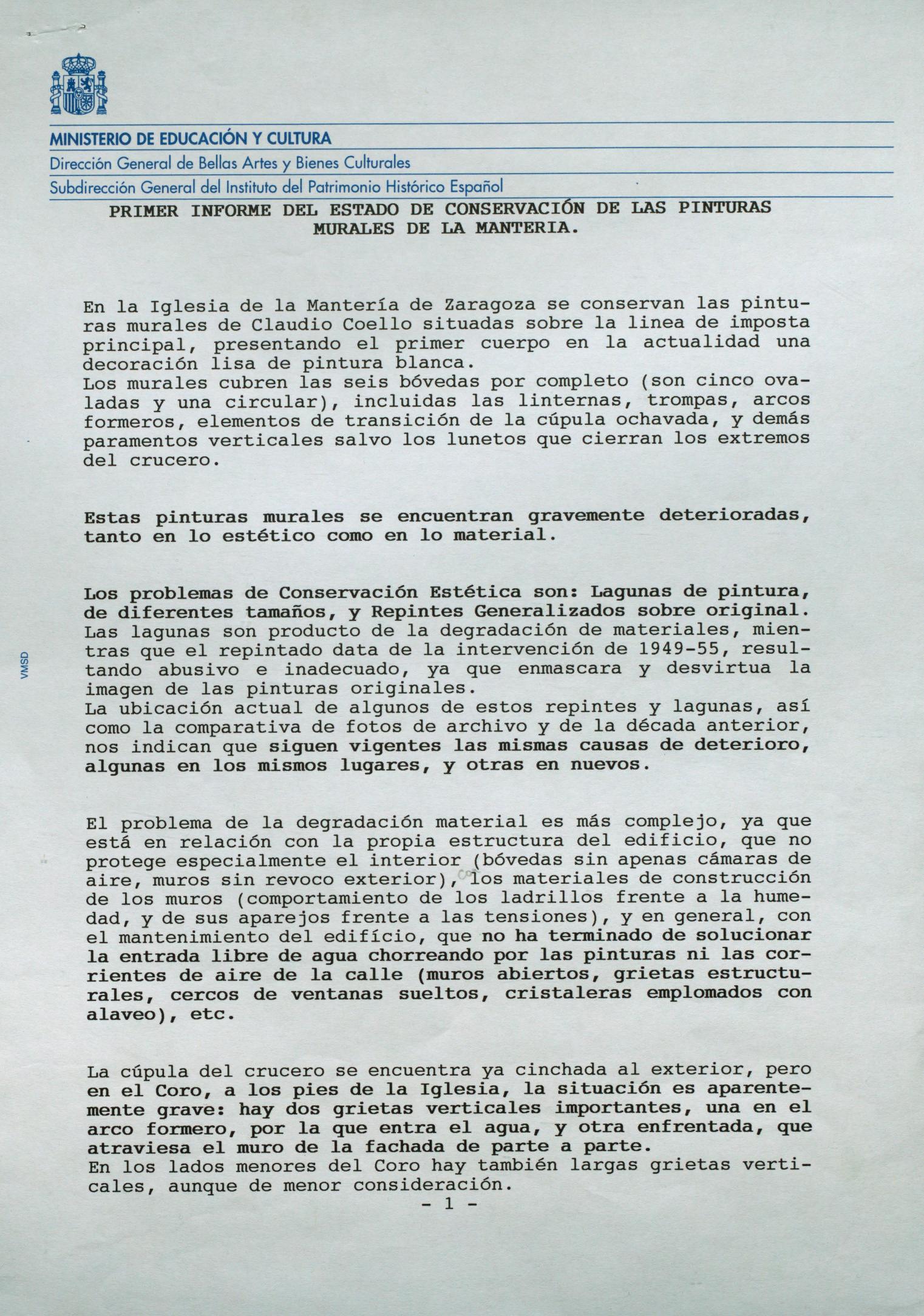 Informe sobre el proyecto de restauración de las pinturas murales de Claudio Coello, en la Iglesia de la Mantería (Zaragoza)