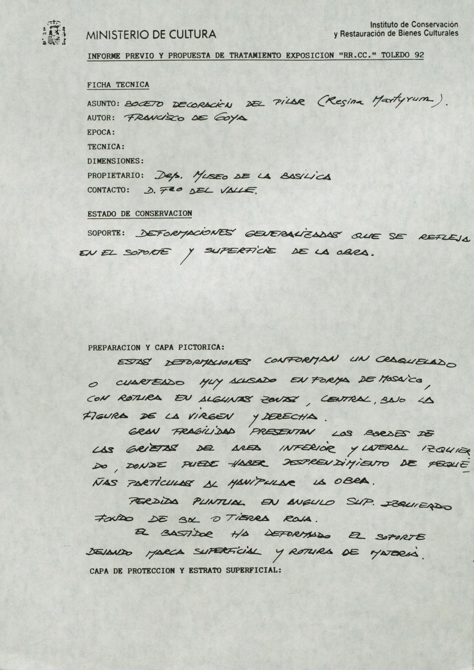 Informe de conservación y propuesta de tratamiento de los bocetos de la "Virgen de la Gloria" o "Regina Martyrum", de Francisco de Goya, para la decoración de la Basílica del Pilar (Museo del Pilar de Zaragoza)