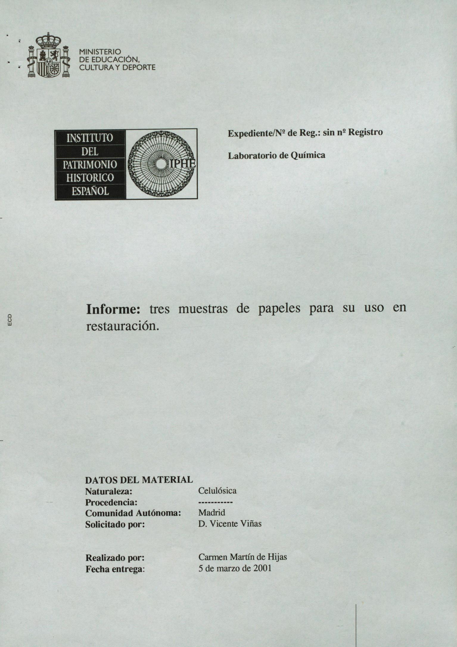 Informe sobre el análisis químico de tres muestras de papel para su uso en restauración (Madrid)