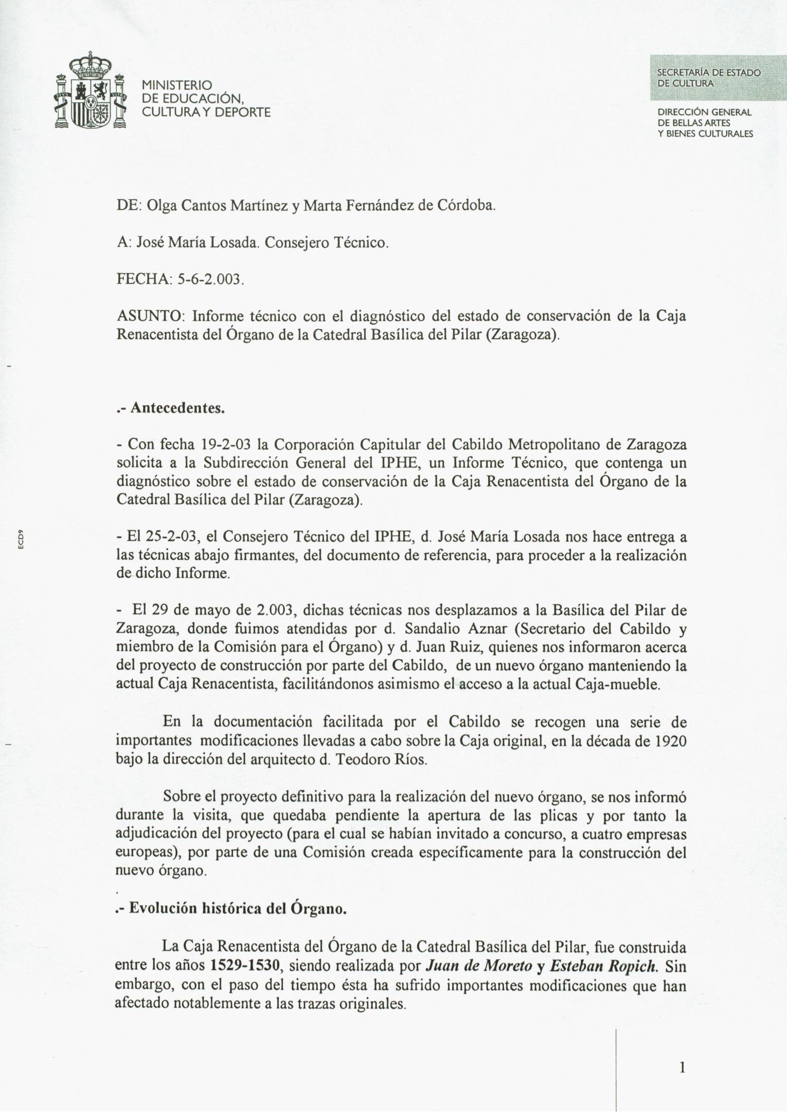 Informe de conservación de la caja renacentista del órgano procedente de la Catedral Basílica del Pilar de Zaragoza