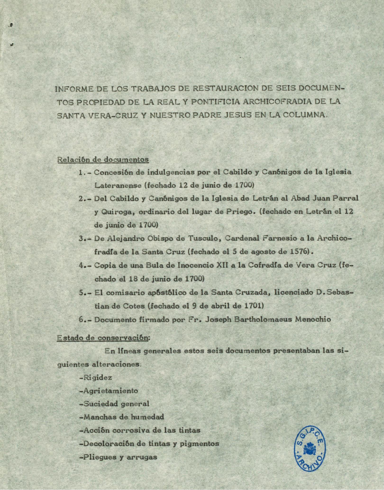 Restauración de seis documentos procedentes de la Real y Pontificia Archicofradía de la Santa Vera-Cruz y Nuestro Padre Jesús en la Columna