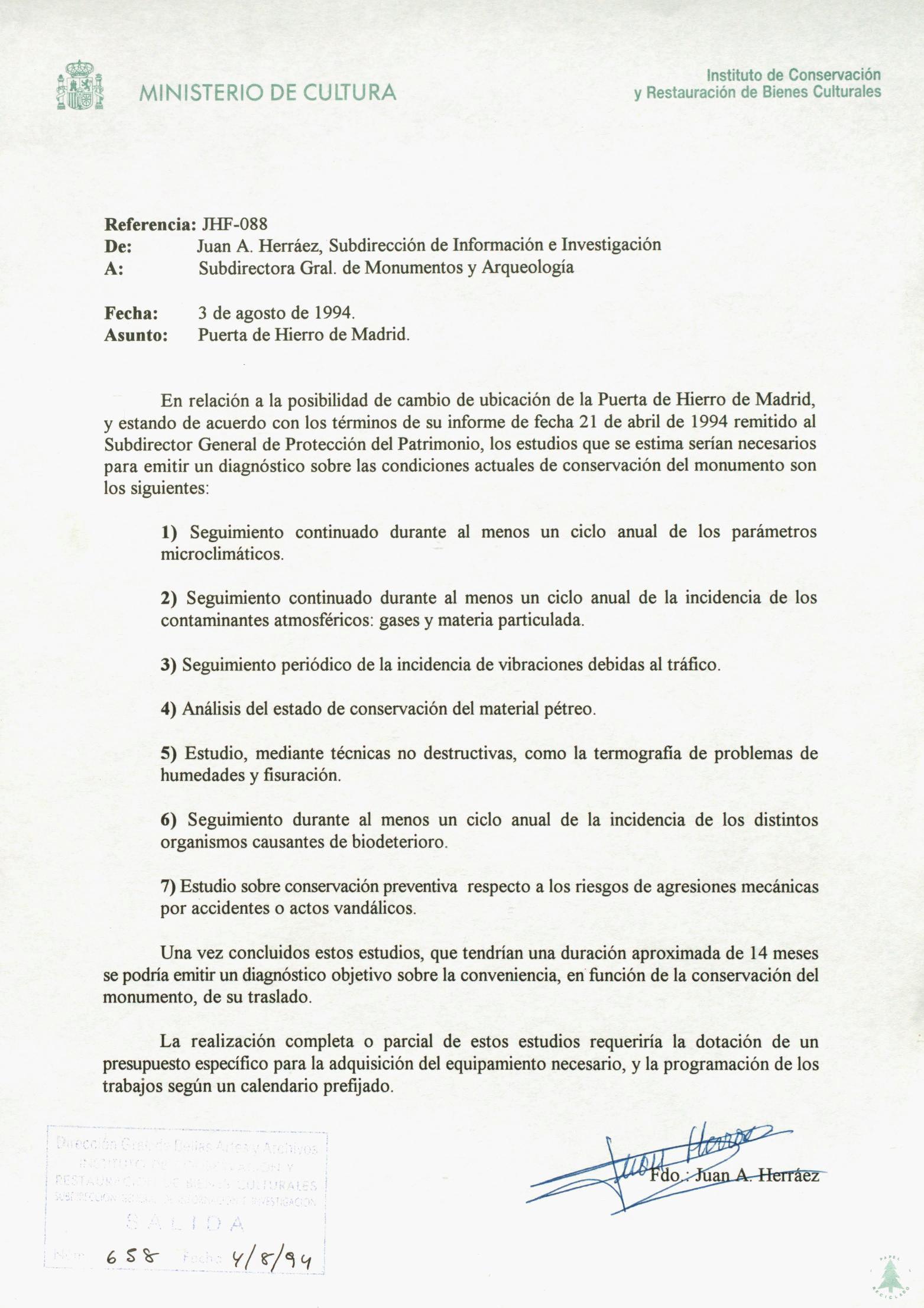 Informe de visita para la conservación y traslado de la Puerta de Hierro (Madrid)