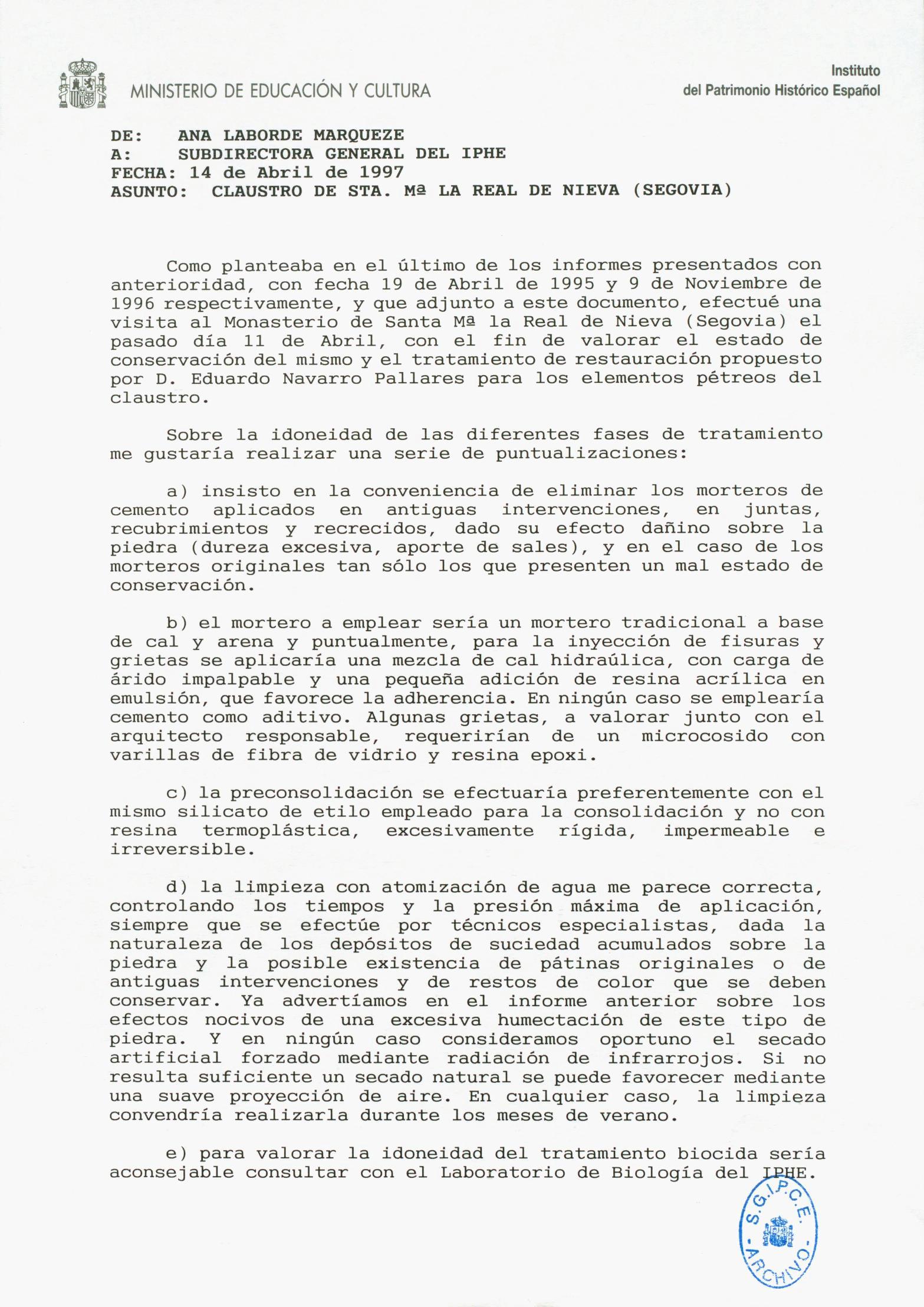 Informe de visita sobre la inspección de los trabajos de restauración de los elementos pétreos del claustro del Monasterio de Santa María La Real de Nieva (Segovia)