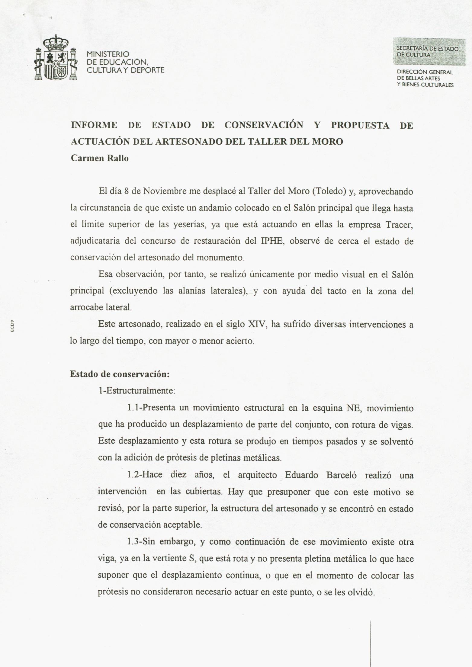 Informe de visita para la restauración de los artesonados del Taller del Moro de Toledo