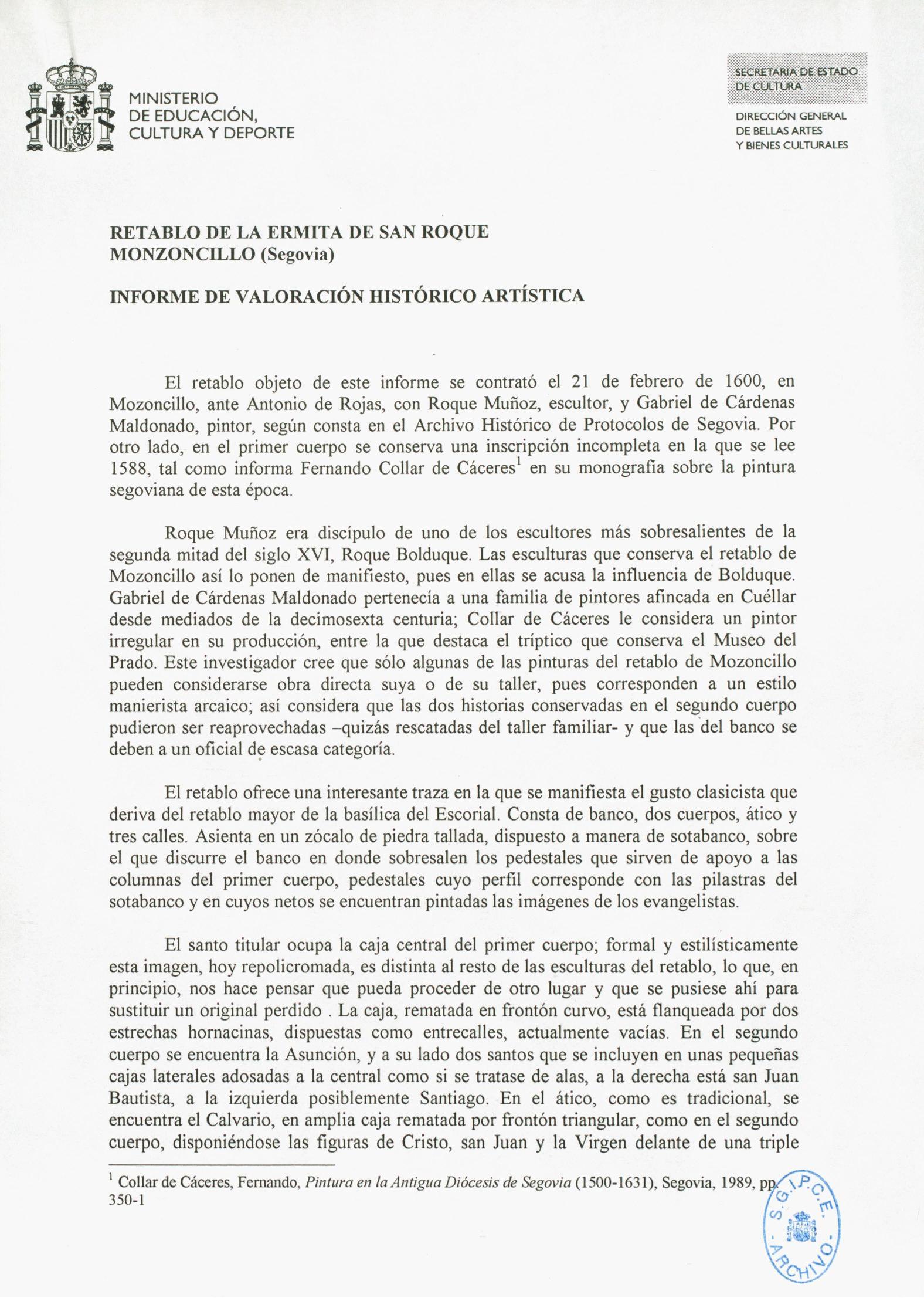 Informe de valoración histórico-artístico del retablo de la Ermita de San Roque de Mozoncillo (Segovia)