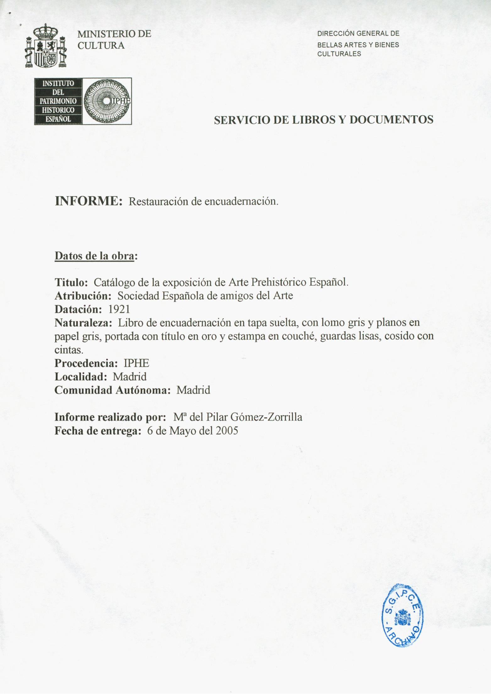 Restauración de encuadernación del Catálogo de la Exposición de Arte Prehistórico español de 1921, procedente del Instituto del Patrimonio Histórico Español (Madrid)
