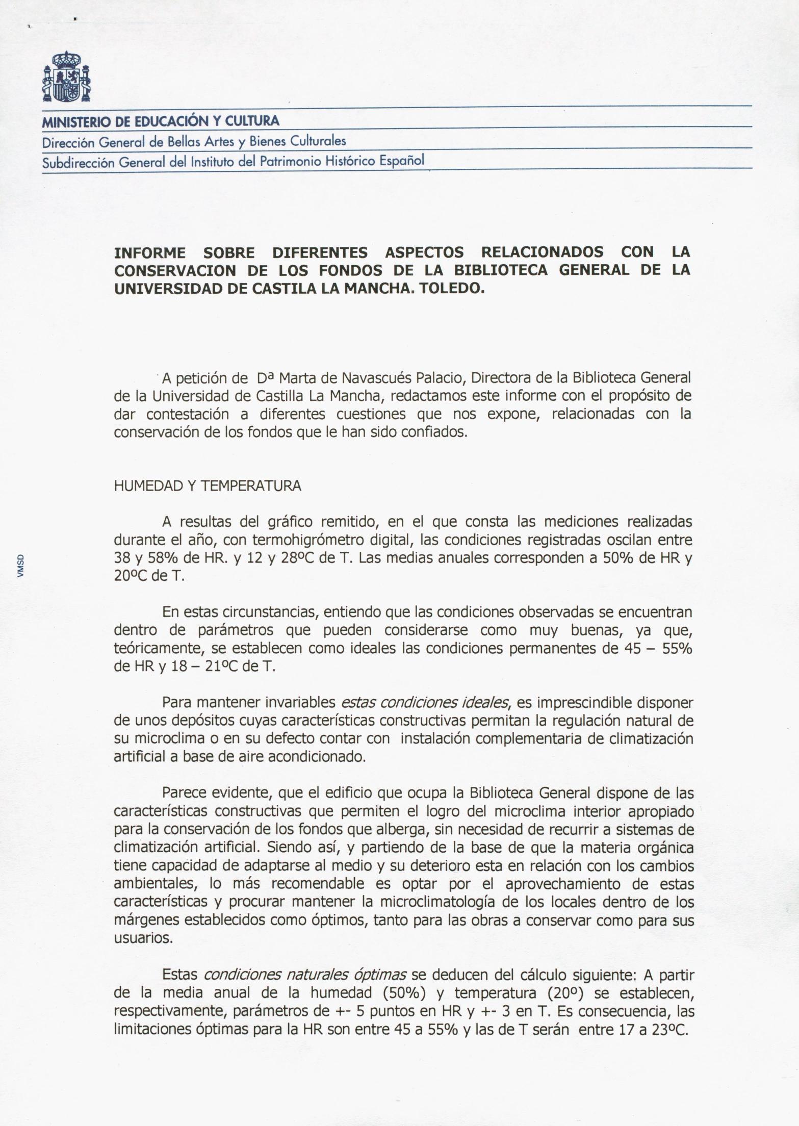 Informe sobre asesoramiento para la conservación de los fondos de la Biblioteca General de la Universidad de Castilla La Mancha (Toledo)