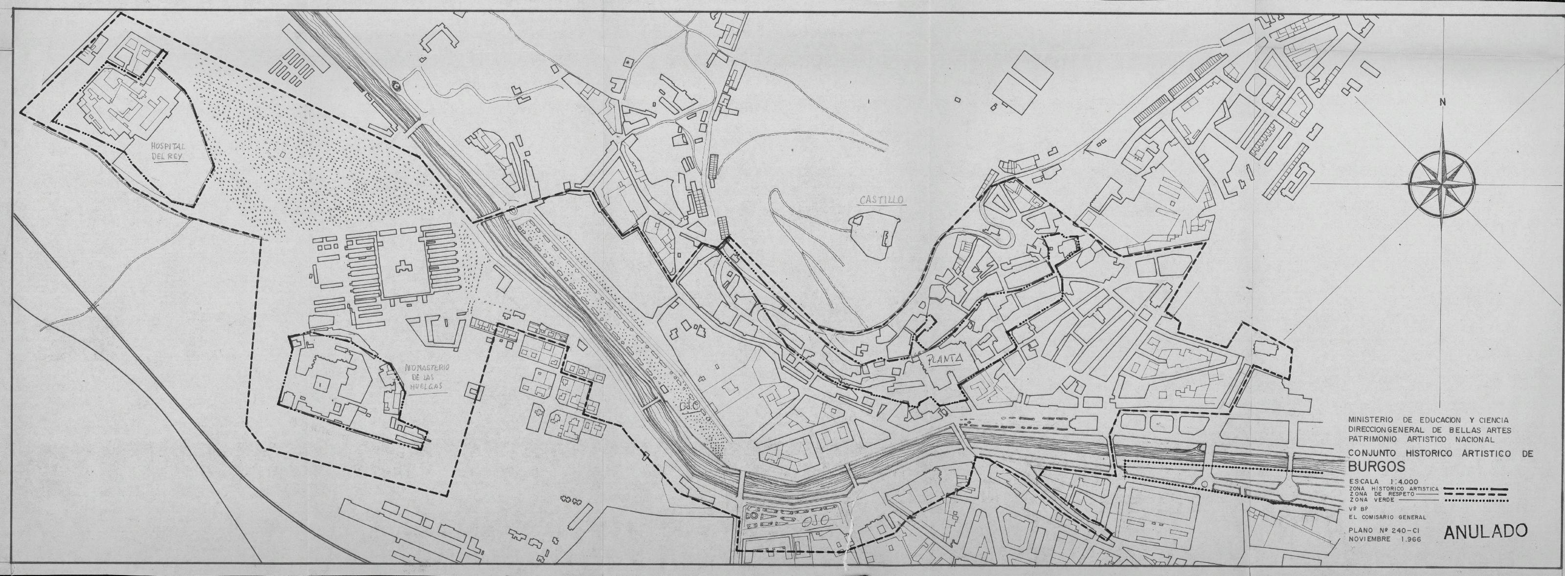 Conjunto Histórico Artístico de Burgos.: Plano general de la ciudad. Delimitaciones de la Zona Histórico Artística, Zona de Respeto y Zona Verde.