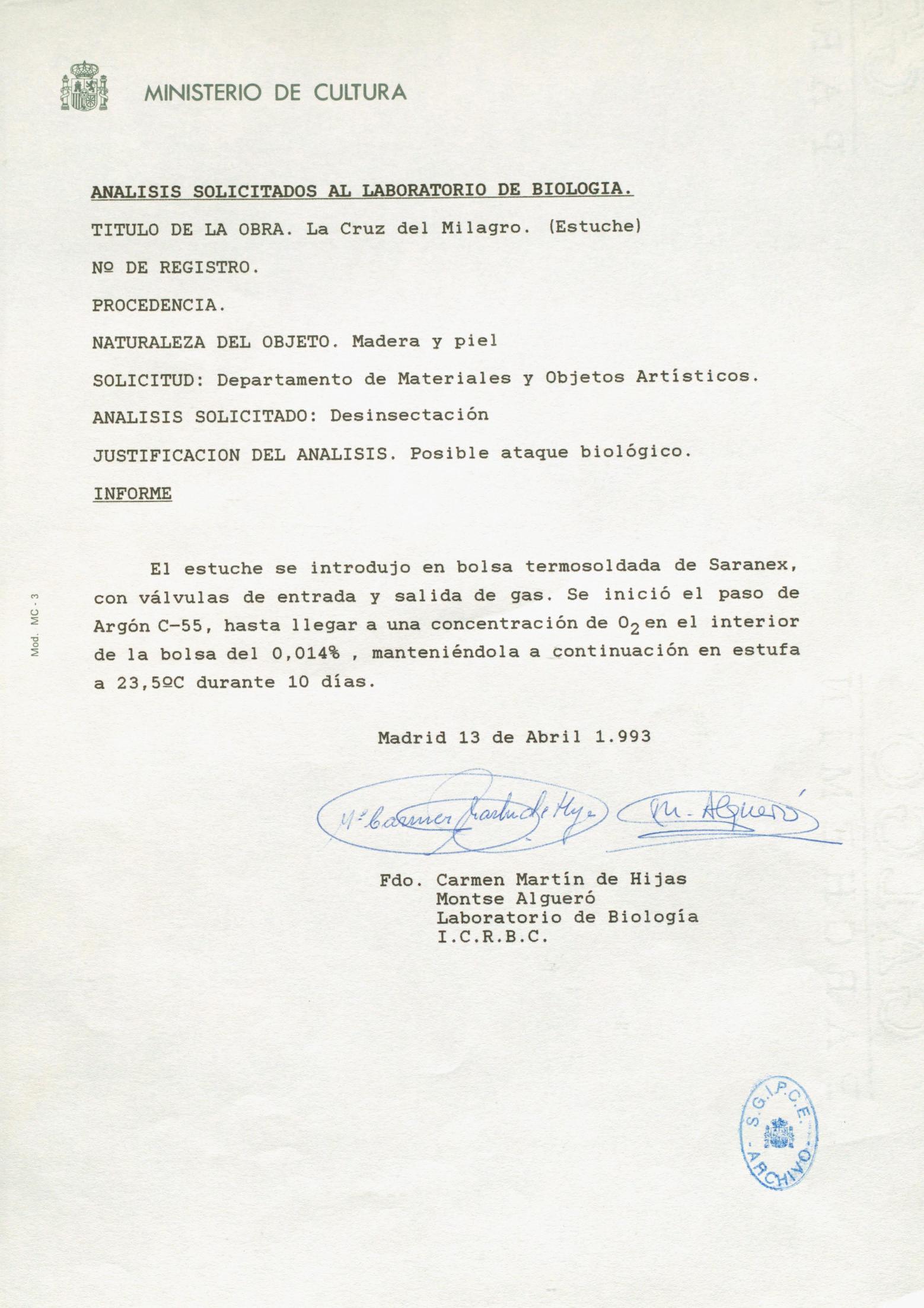 Informe sobre el análisis biológico realizado al estuche de la obra "La cruz del Milagro"