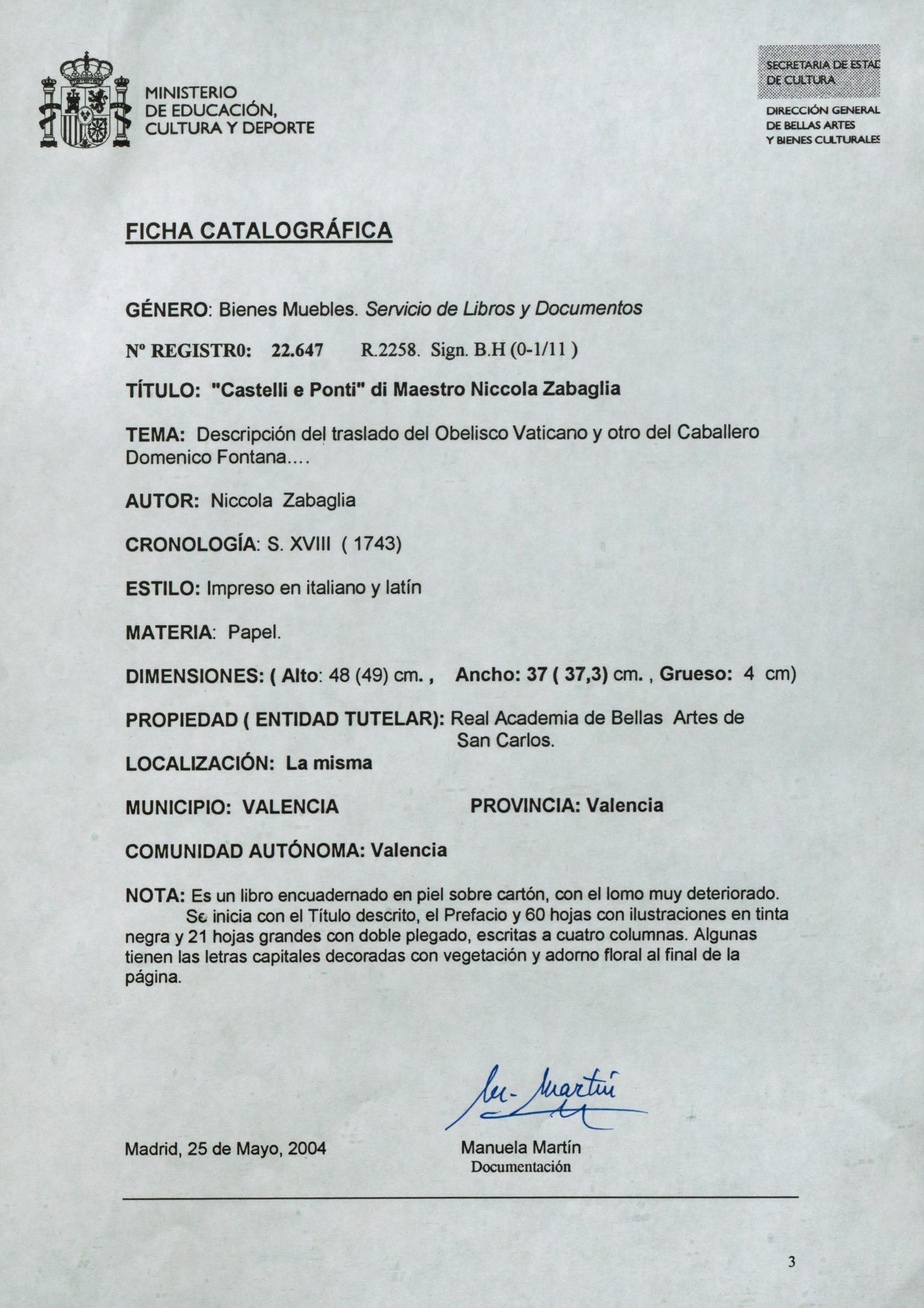 Restauración del libro "Castelli e ponti", de Niccola di Zabaglia, procedente de la Real Academia de Bellas Artes de San Carlos de Valencia