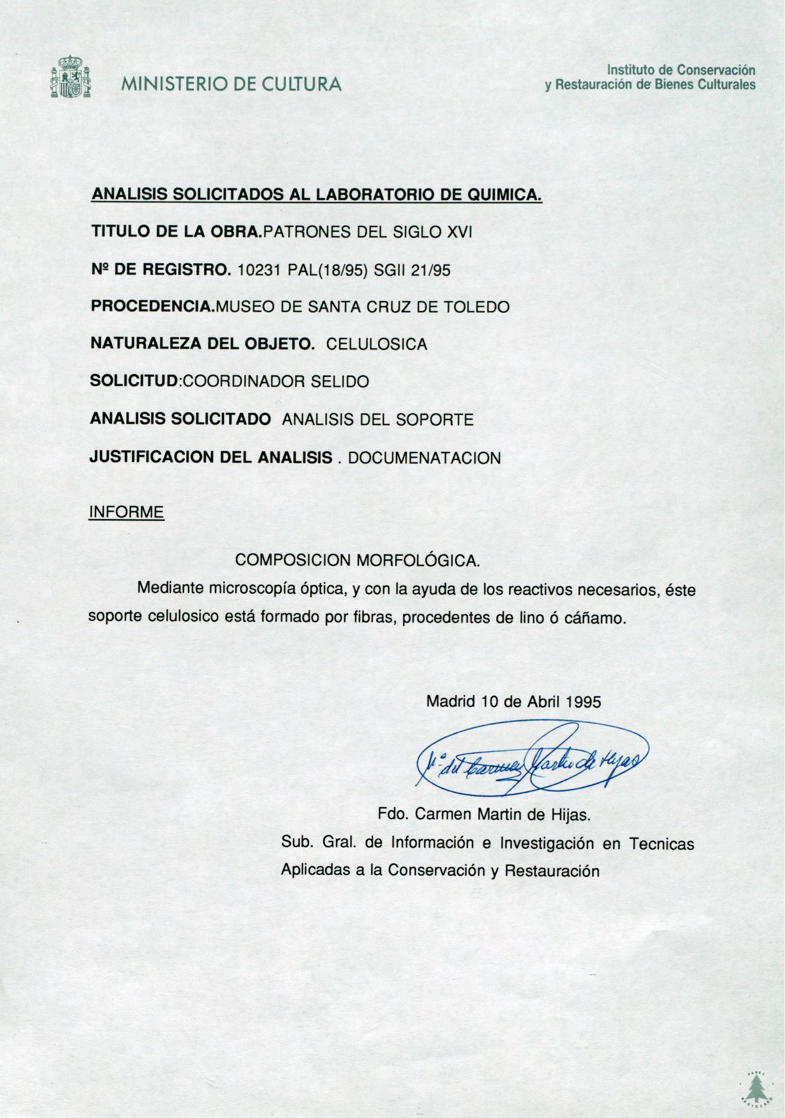 Informe de análisis químico del cuadernillo en papel de patrones del siglo XVI, procedente del Museo de Santa Cruz de Toledo