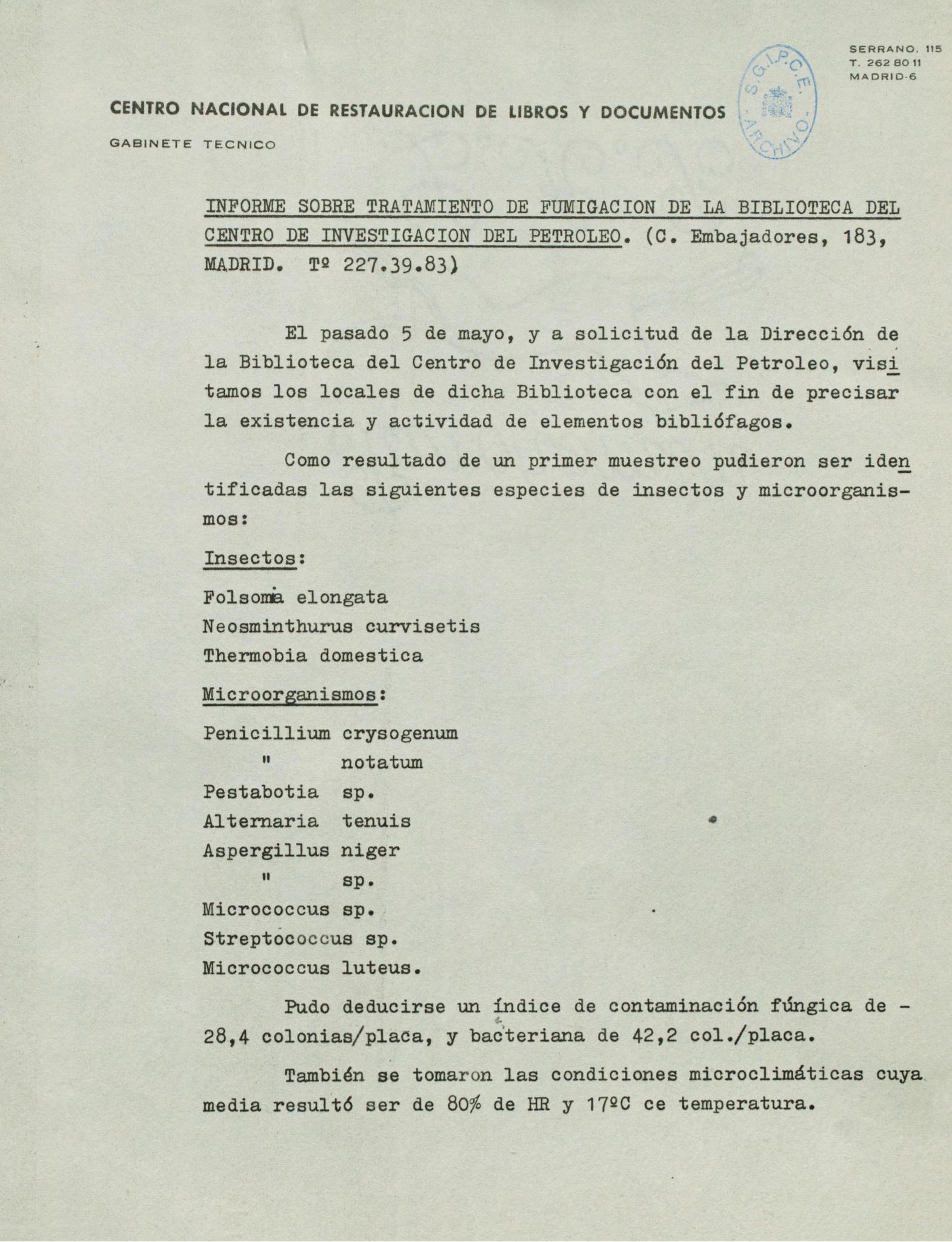 Informe sobre el tratamiento de fumigación para la conservación de los fondos de la bilblioteca del Centro de Investigación del Petróleo de Madrid