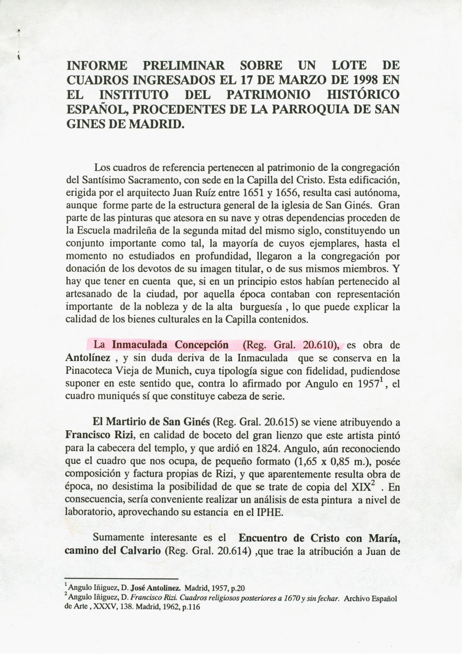 Restauración de cinco óleos sobre lienzo procedentes de la Iglesia de San Ginés (Madrid)