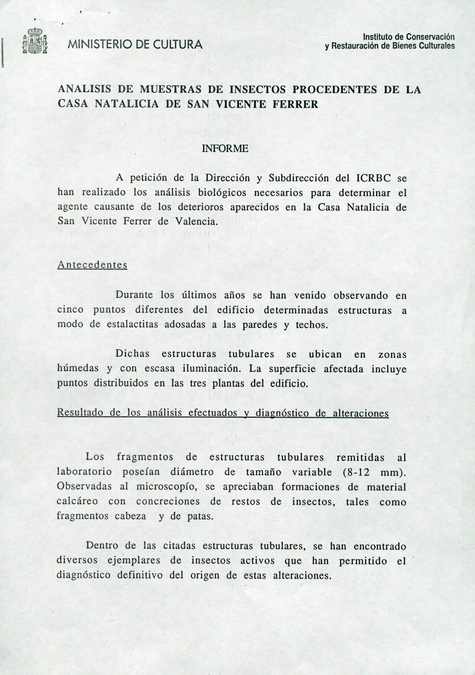 Informe de análisis de muestras de insectos, procedentes de la Casa Natalicia de San Vicente Ferrer de Valencia