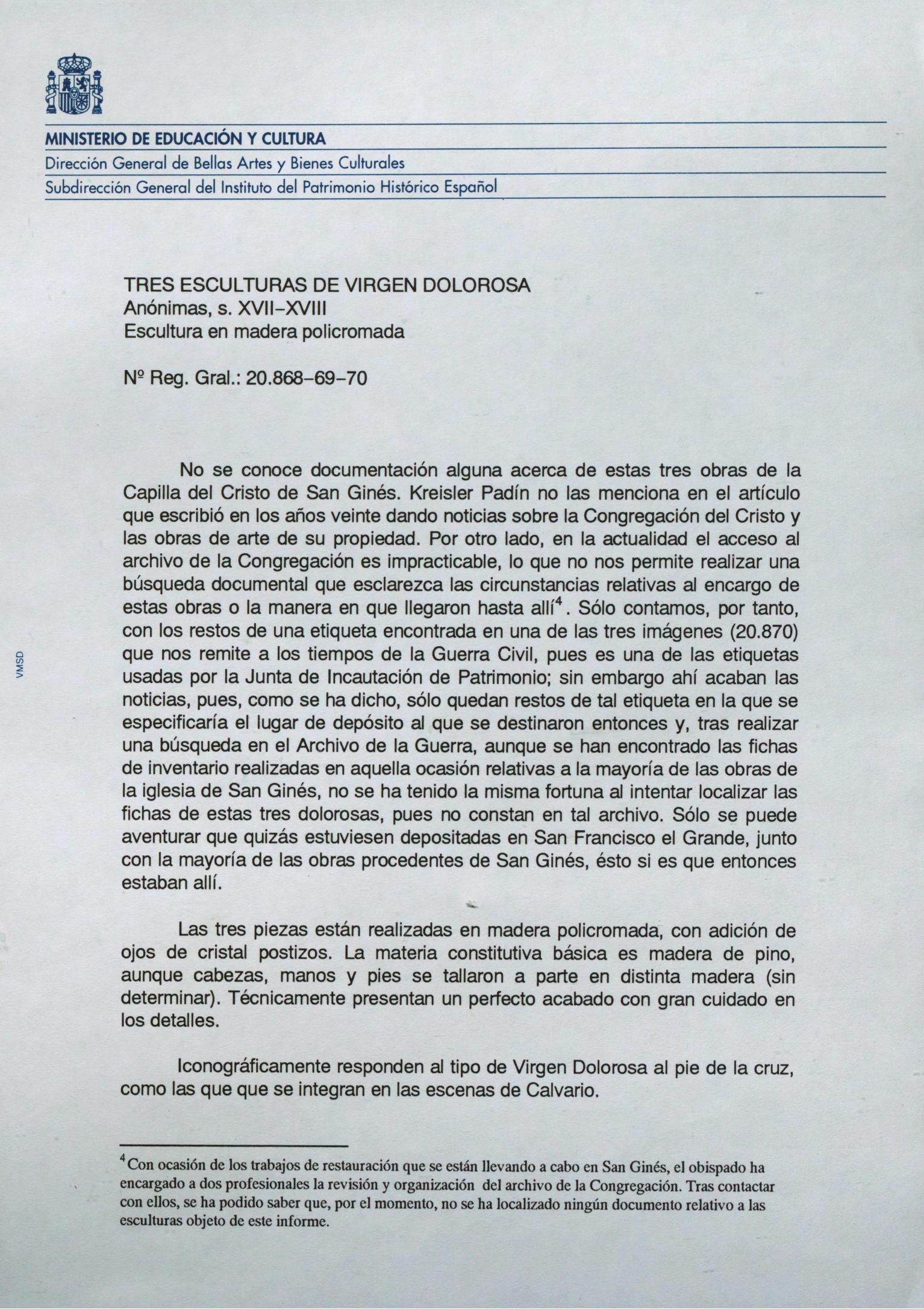 Restauración de tres esculturas de madera policromada de la "Virgen Dolorosa", procedentes de la Iglesia de San Ginés (Madrid)