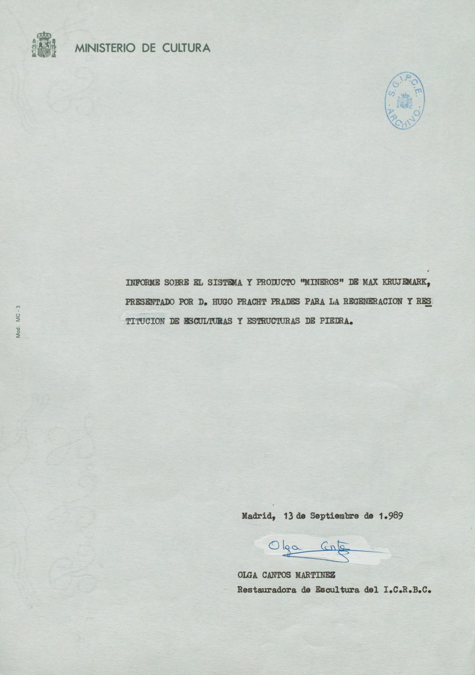 Informe sobre el sistema y producto "Mineros", elaborado por Max Krujemark, para la regeneración y restitución de esculturas y estructuras de piedra