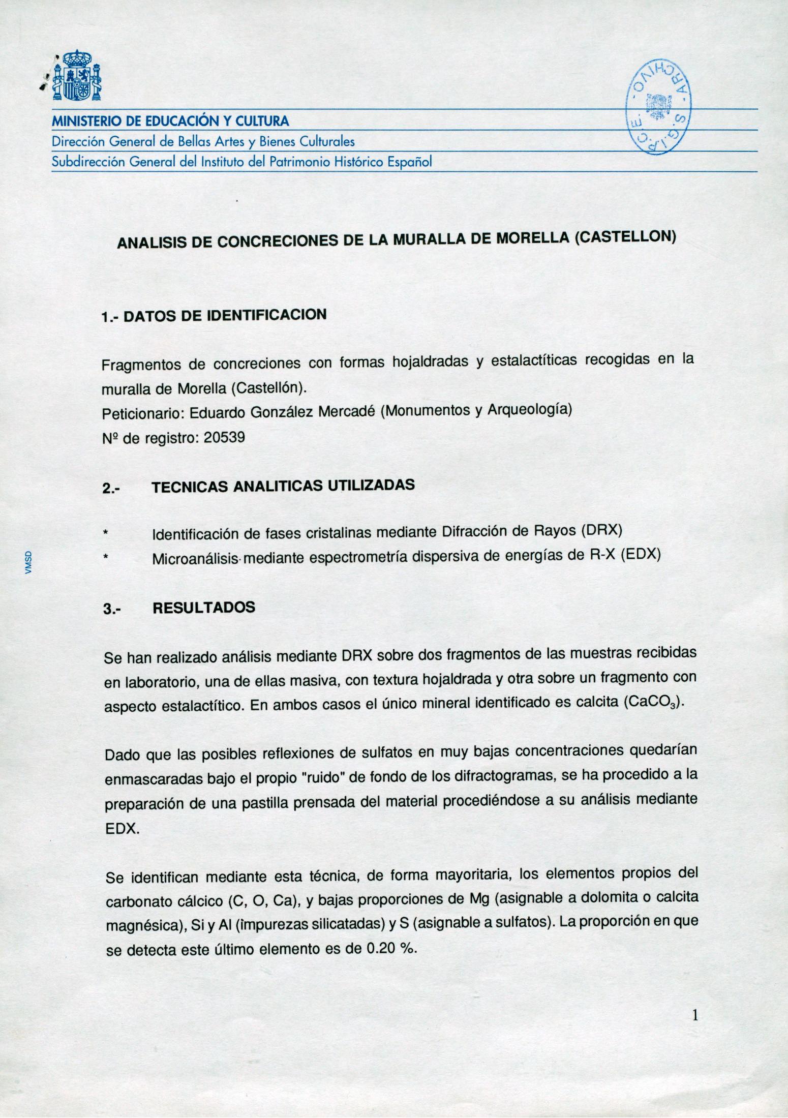 Informe sobre el análisis de concreciones de la muralla de Morella (Castellón)