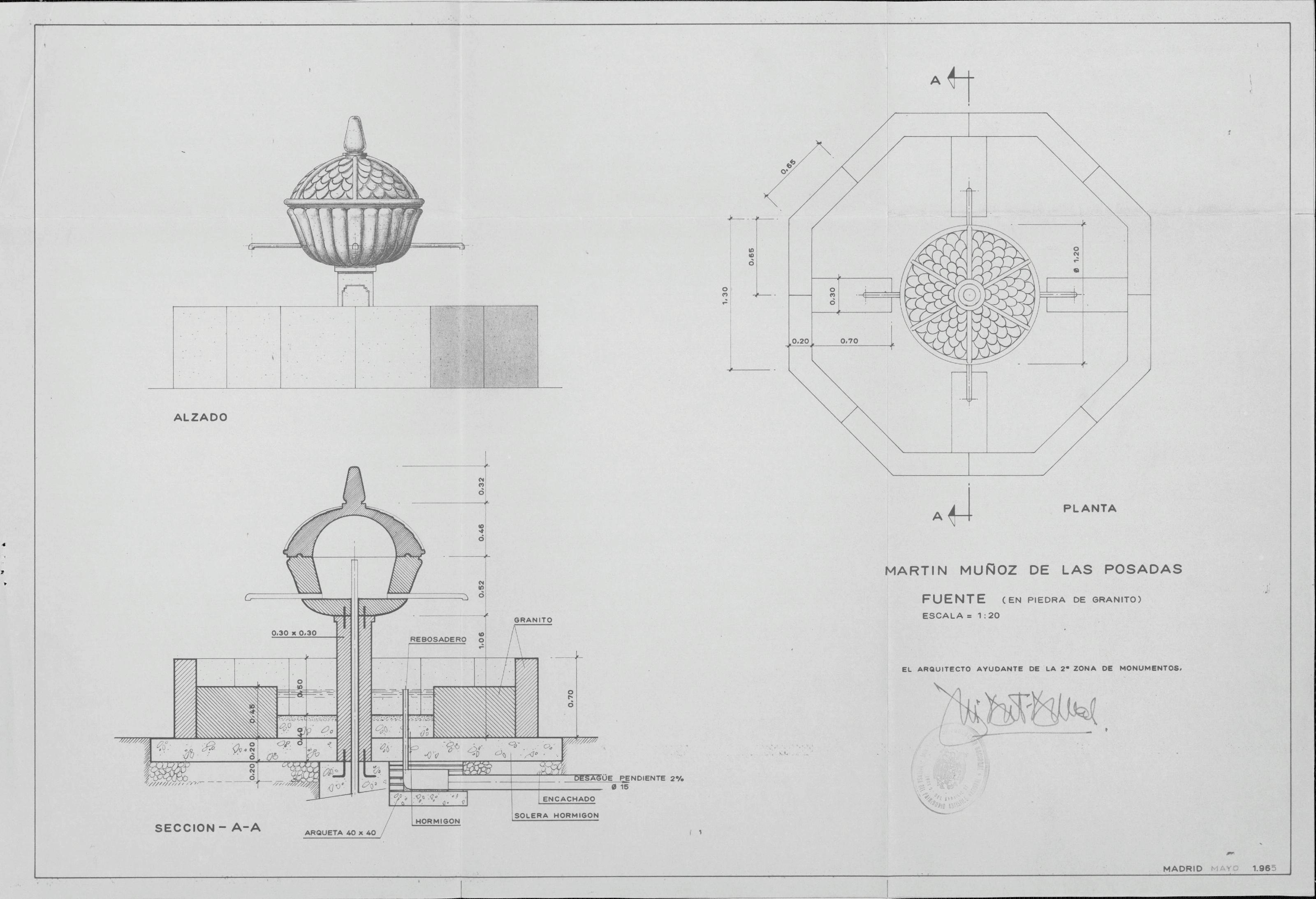 Plaza de Martín Muñoz de las Posadas. Segovia.: Planta, alzado y sección A-A' de la fuente